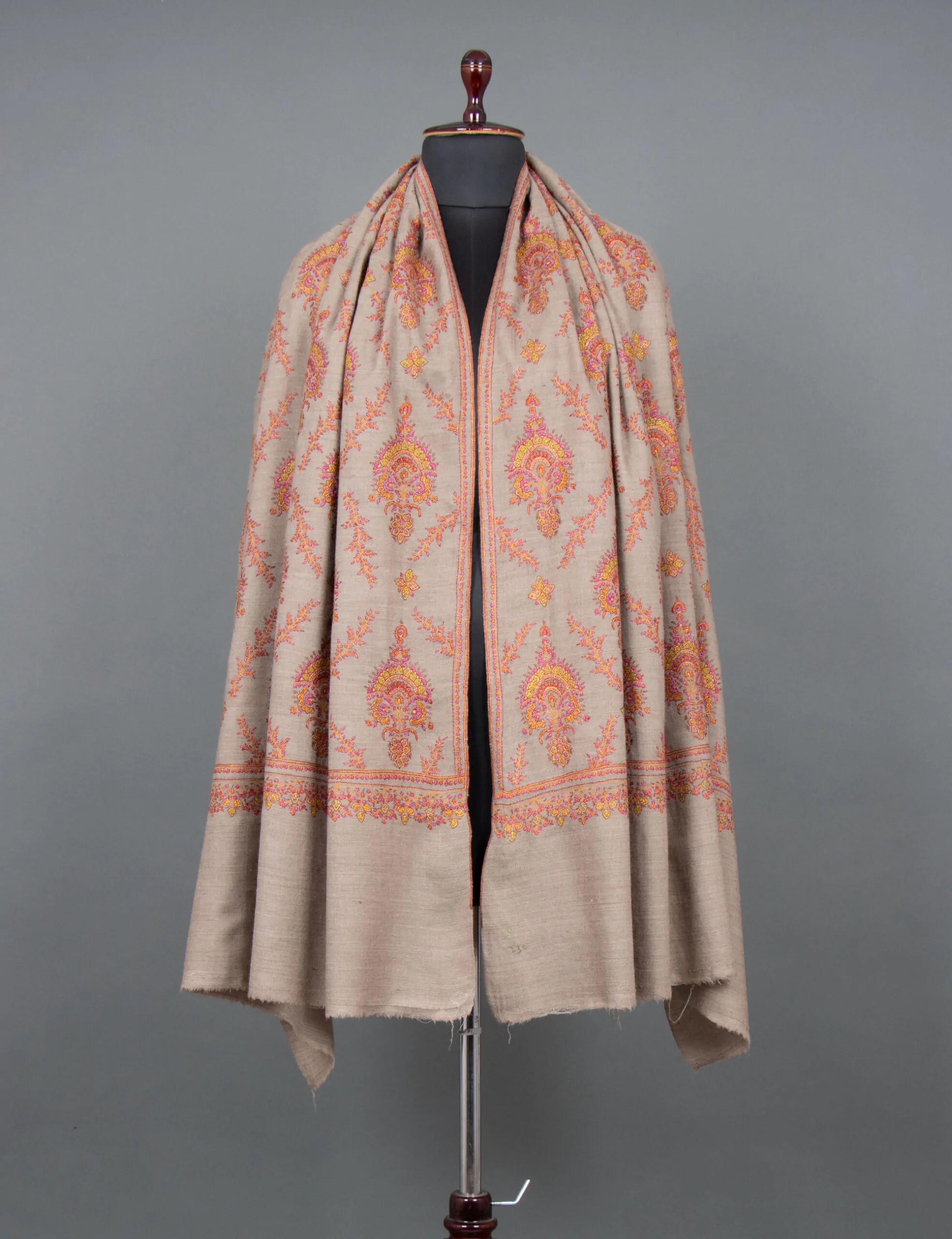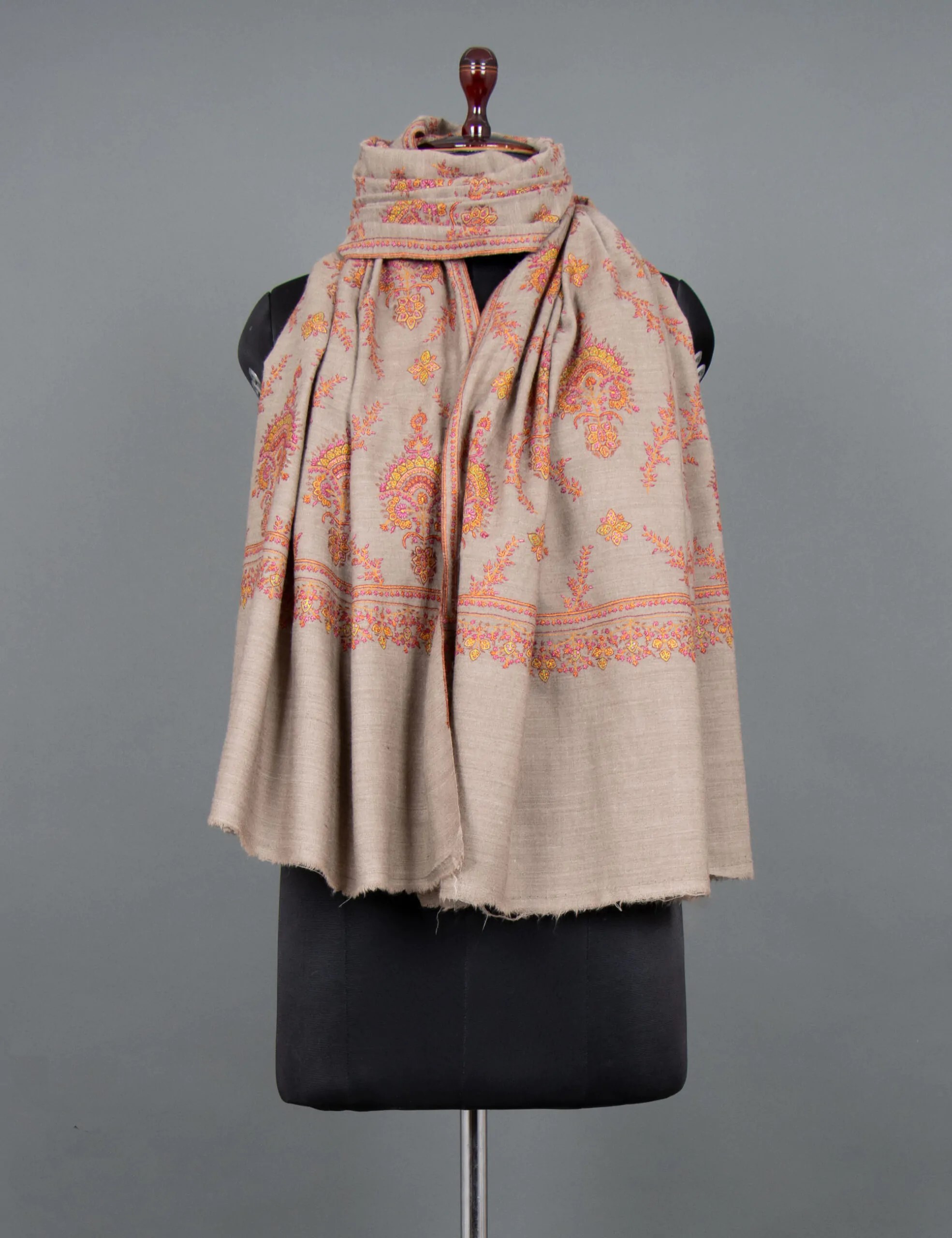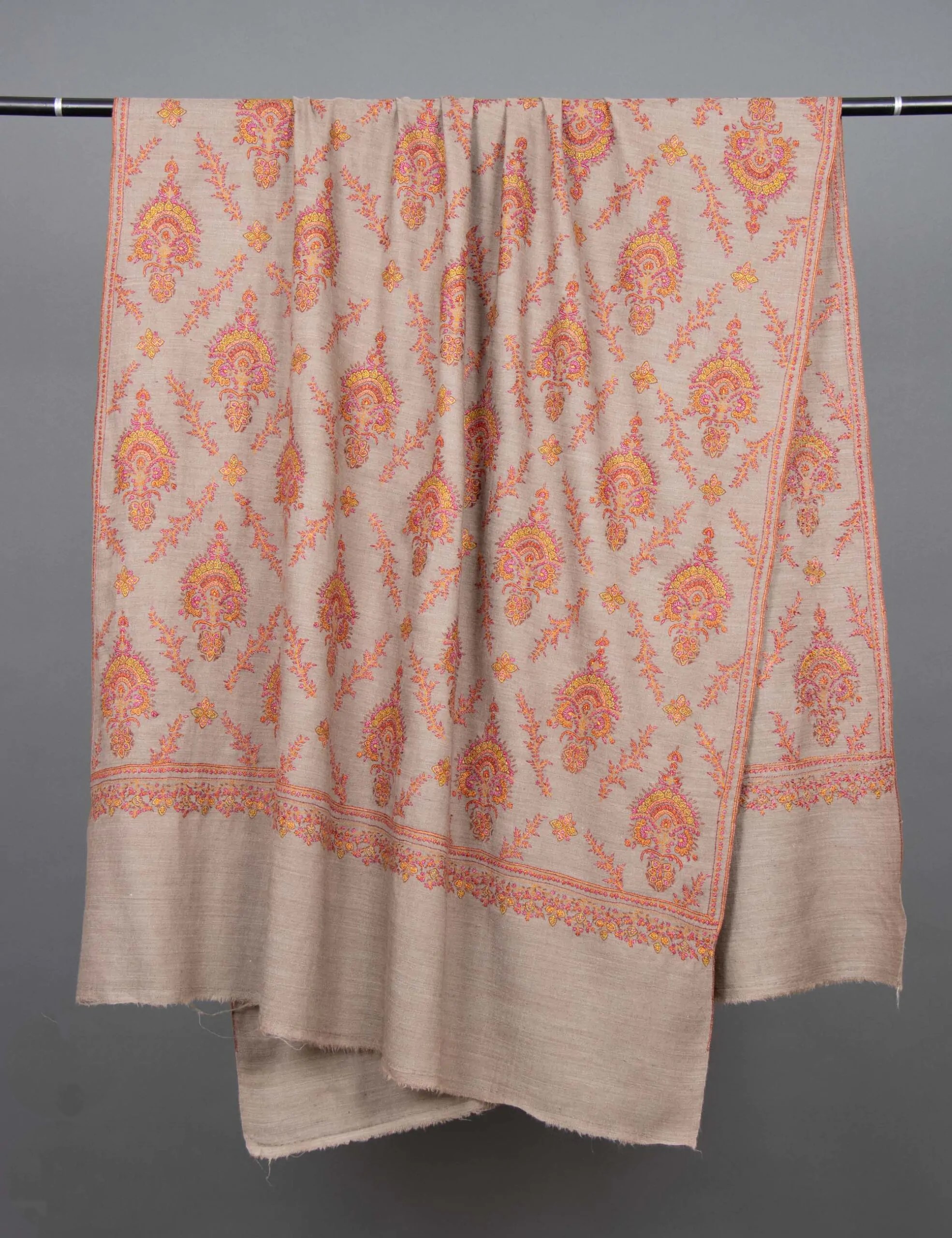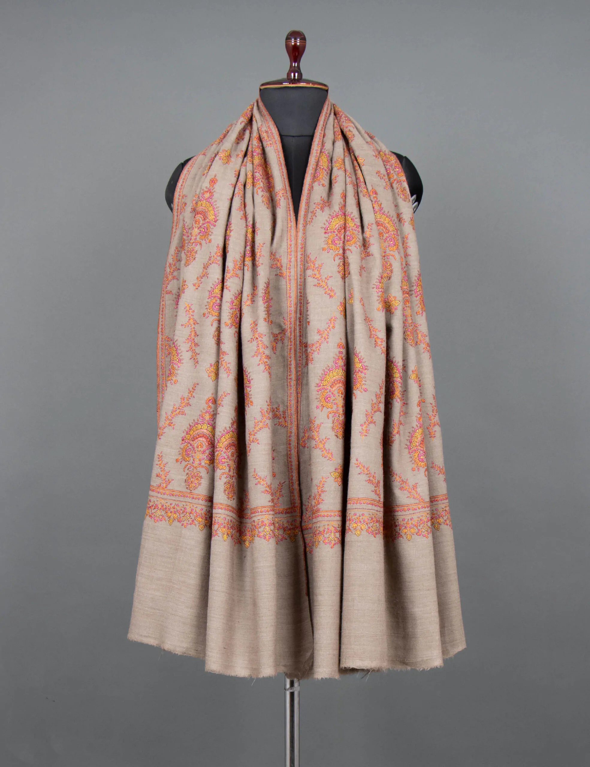 This is a description of an intricately crafted kani shawl, highlighting its traditional craftsmanship, timeless beauty, and exceptional quality. The shawl offers luxurious warmth and softness, handwoven with intricate patterns by skilled artisans. Its Jamawar design exudes regal charm, making it suitable for any occasion.