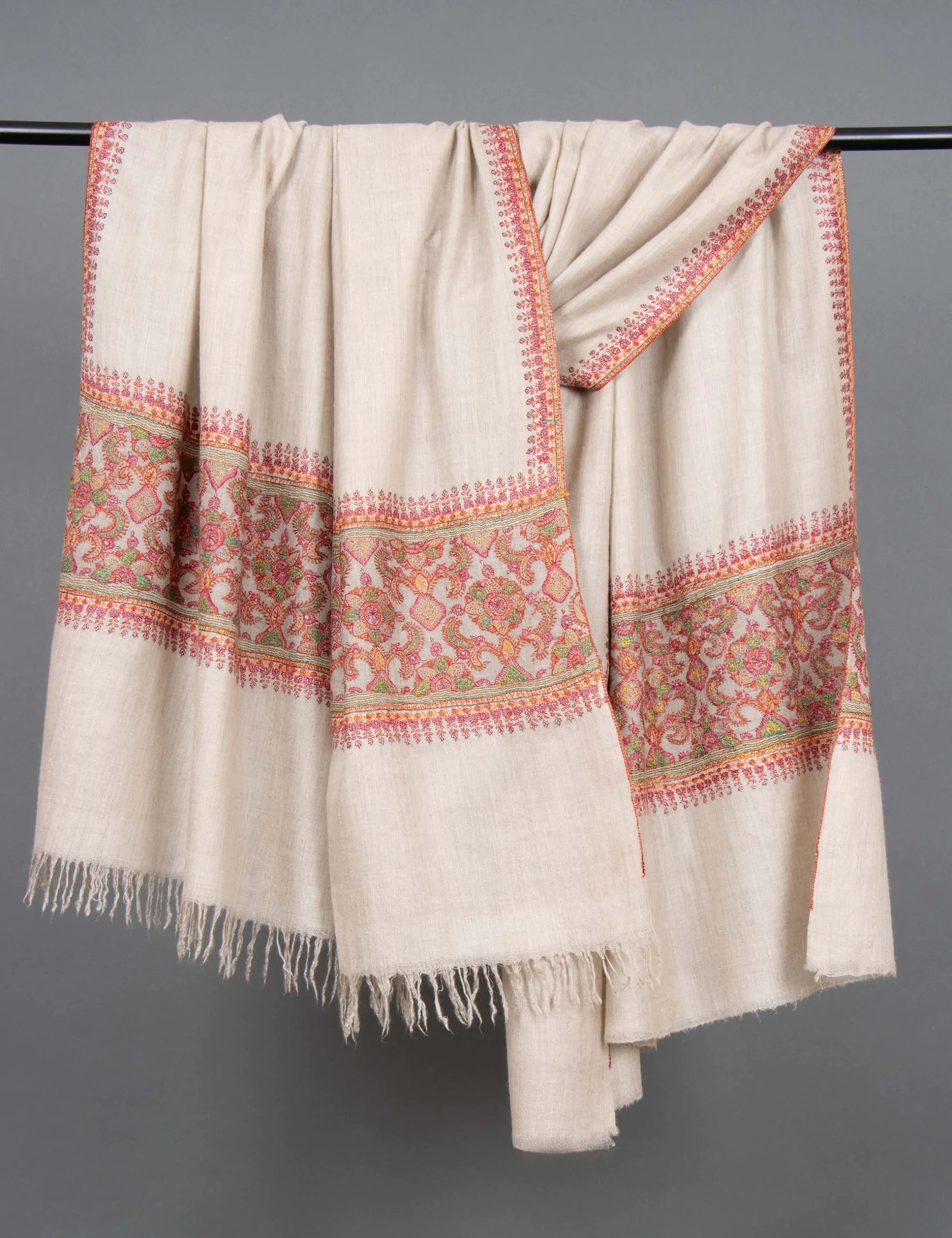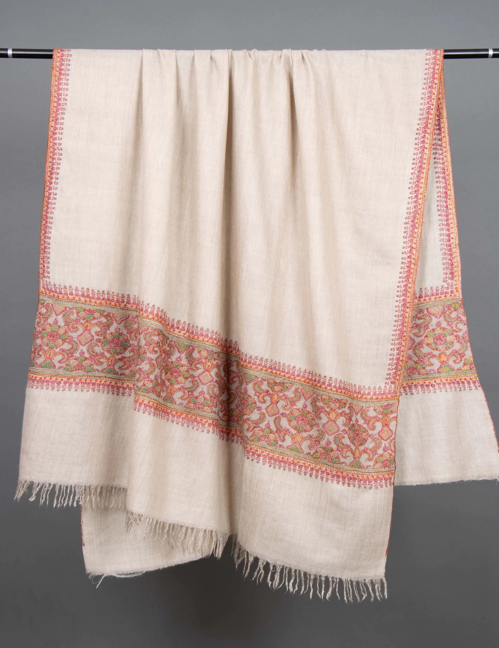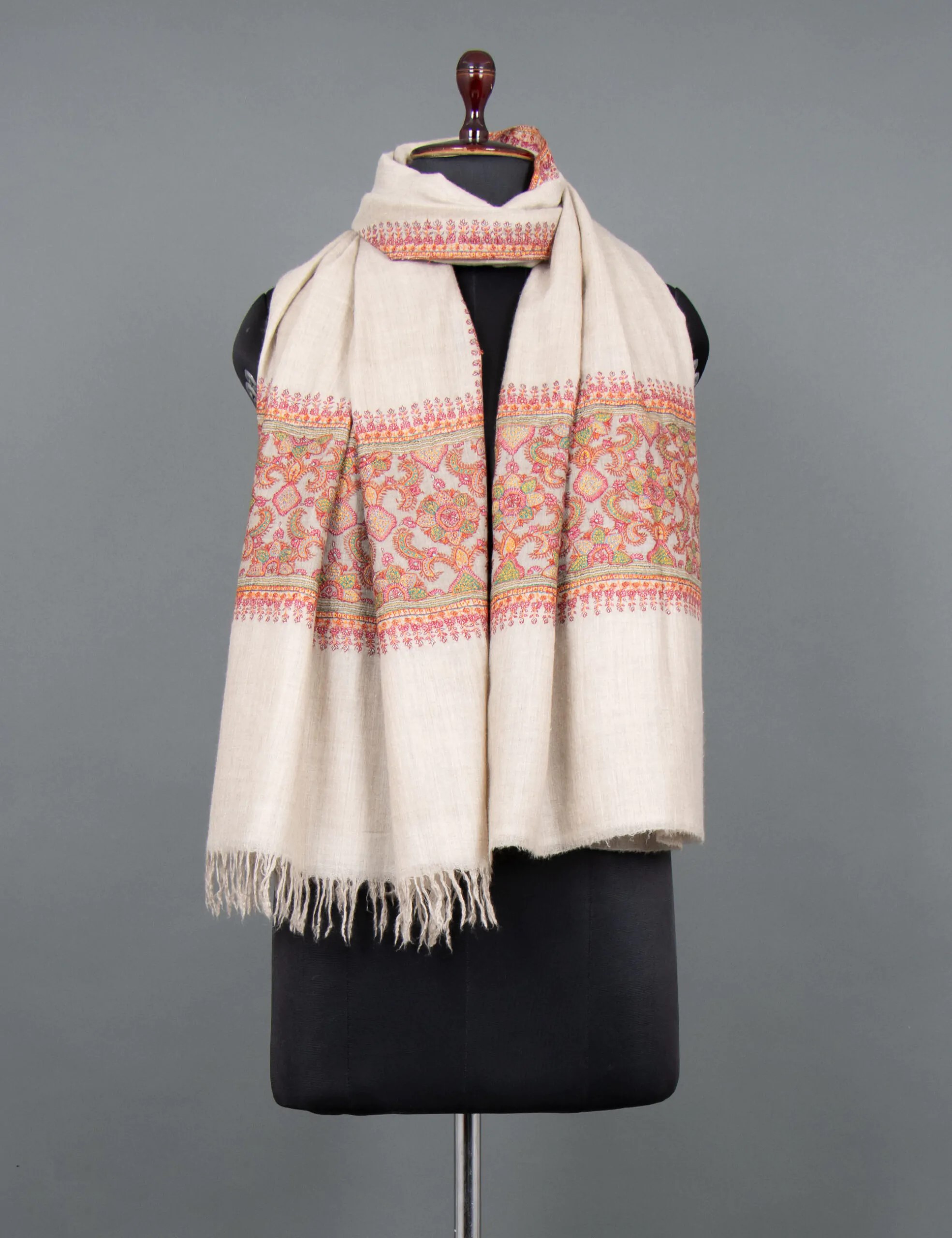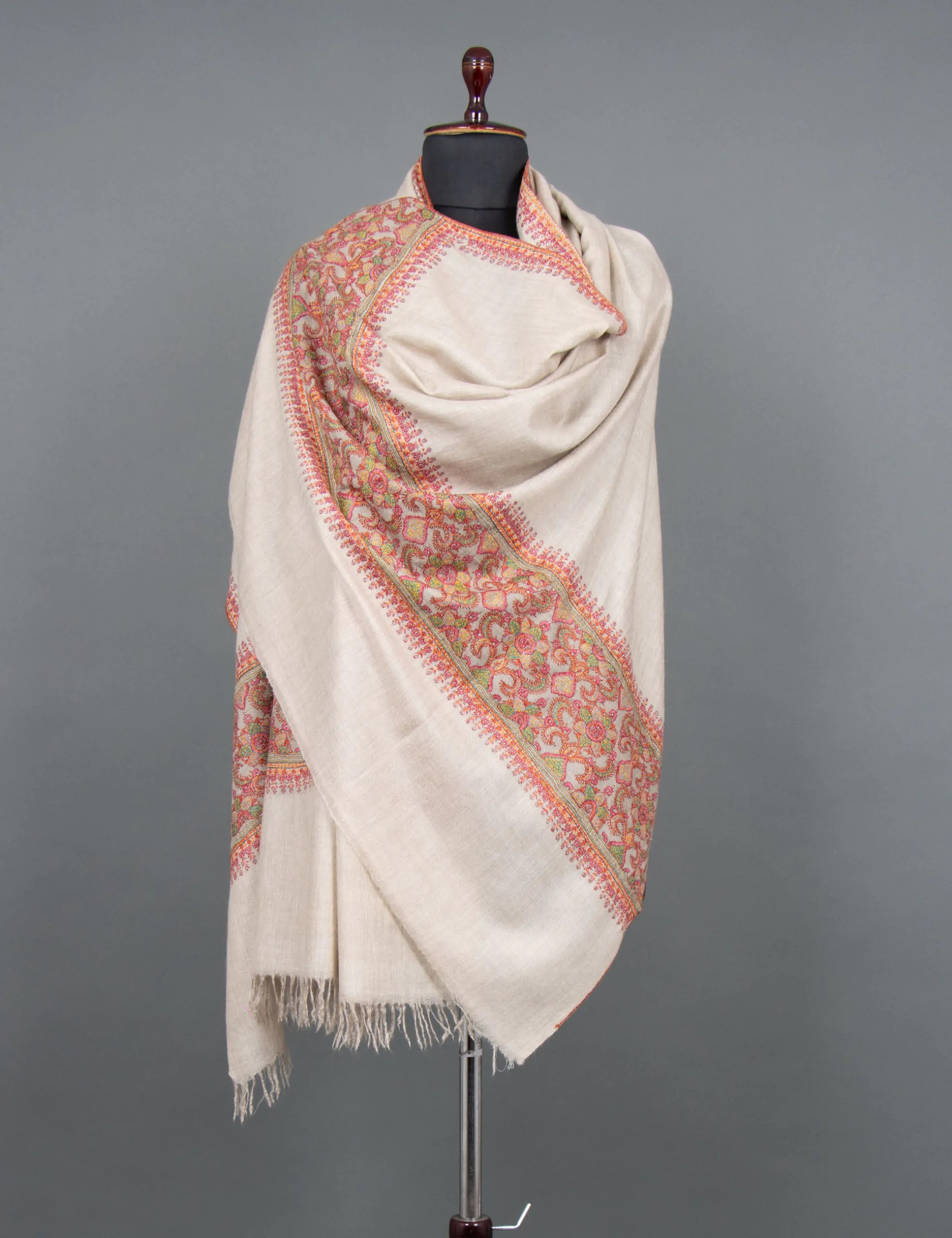This exquisite Pashmina Shawl is a true masterpiece, meticulously crafted with intricate hand-embroidery. Its luxurious design exudes elegance and sophistication, utilizing the finest quality pashmina wool for a soft and lightweight feel. The shawl not only offers unmatched comfort and warmth but also enhances any outfit with its beautiful earthy tones. A perfect accessory for various occasions, this piece elevates your style and captivates with its timeless charm.