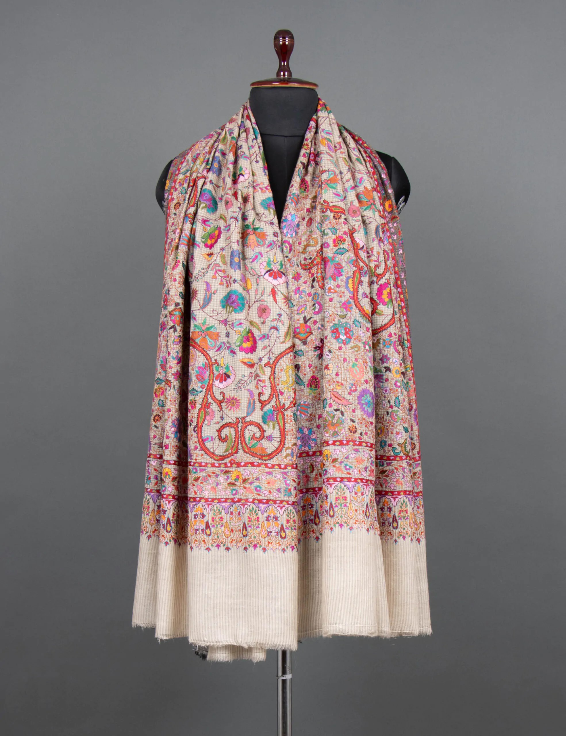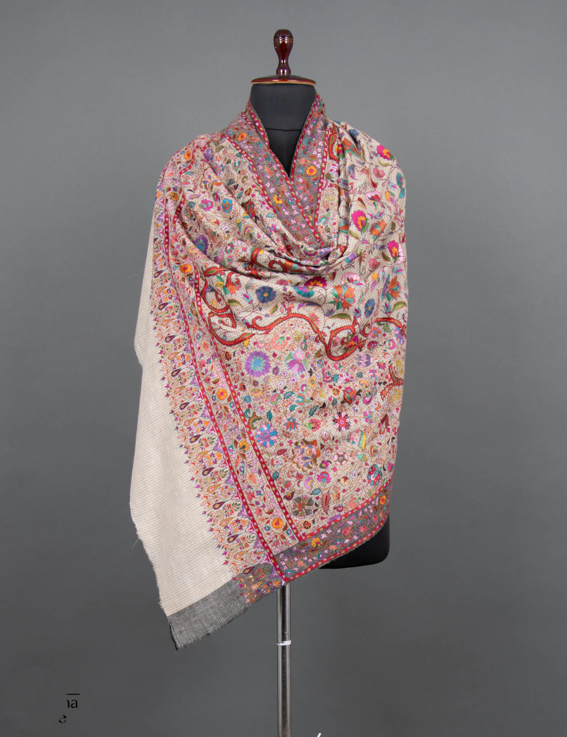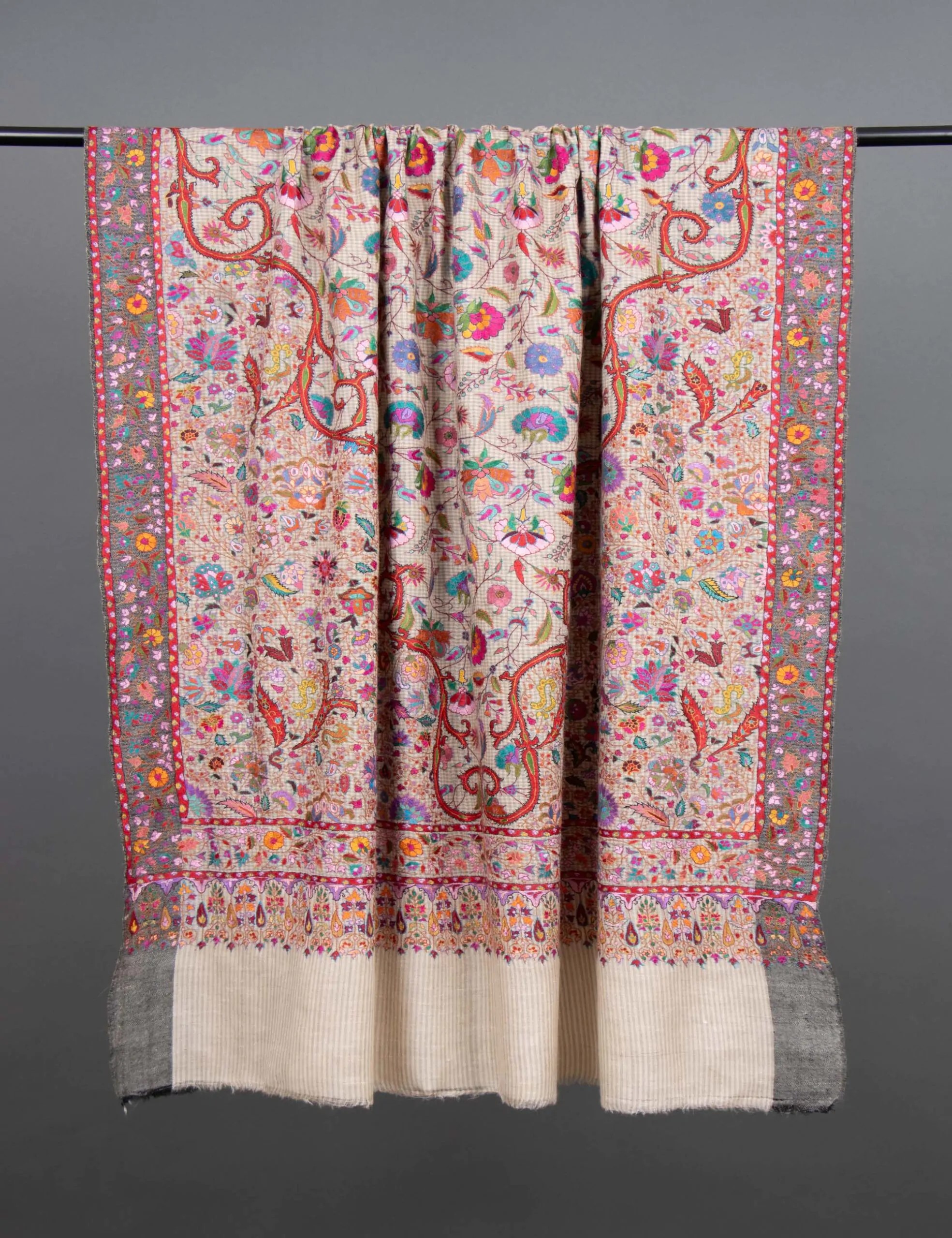 This Pashmina shawl is a luxurious and meticulously hand-embroidered accessory made from the finest, softest Pashmina. It combines elegance and comfort, featuring delicate floral patterns on a backdrop of subtle mini-checks. The design creates a captivating visual appeal, offering a timeless and sophisticated addition to any outfit. The shawl is a statement piece that allows you to wrap yourself in luxury and elevate your style with its exquisite craftsmanship.