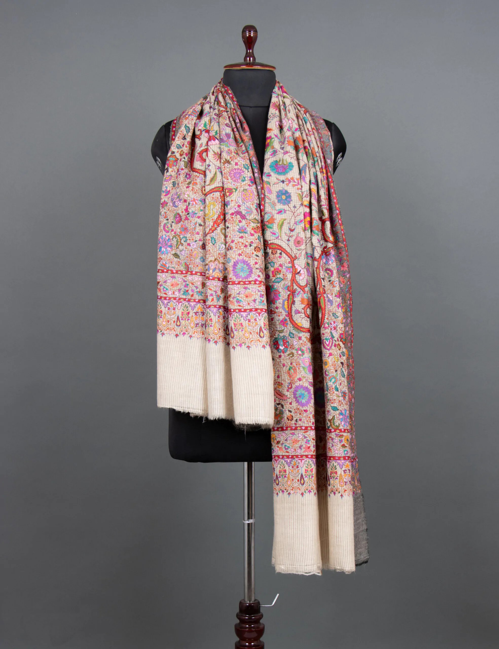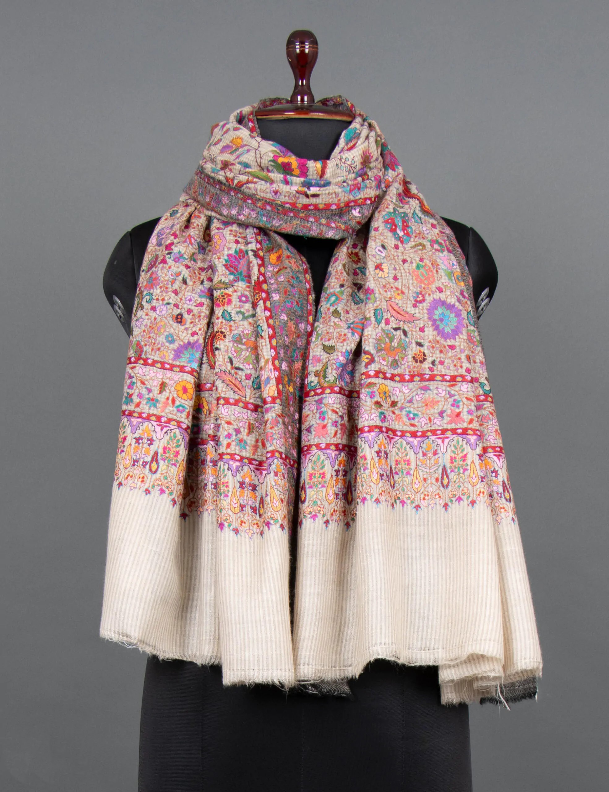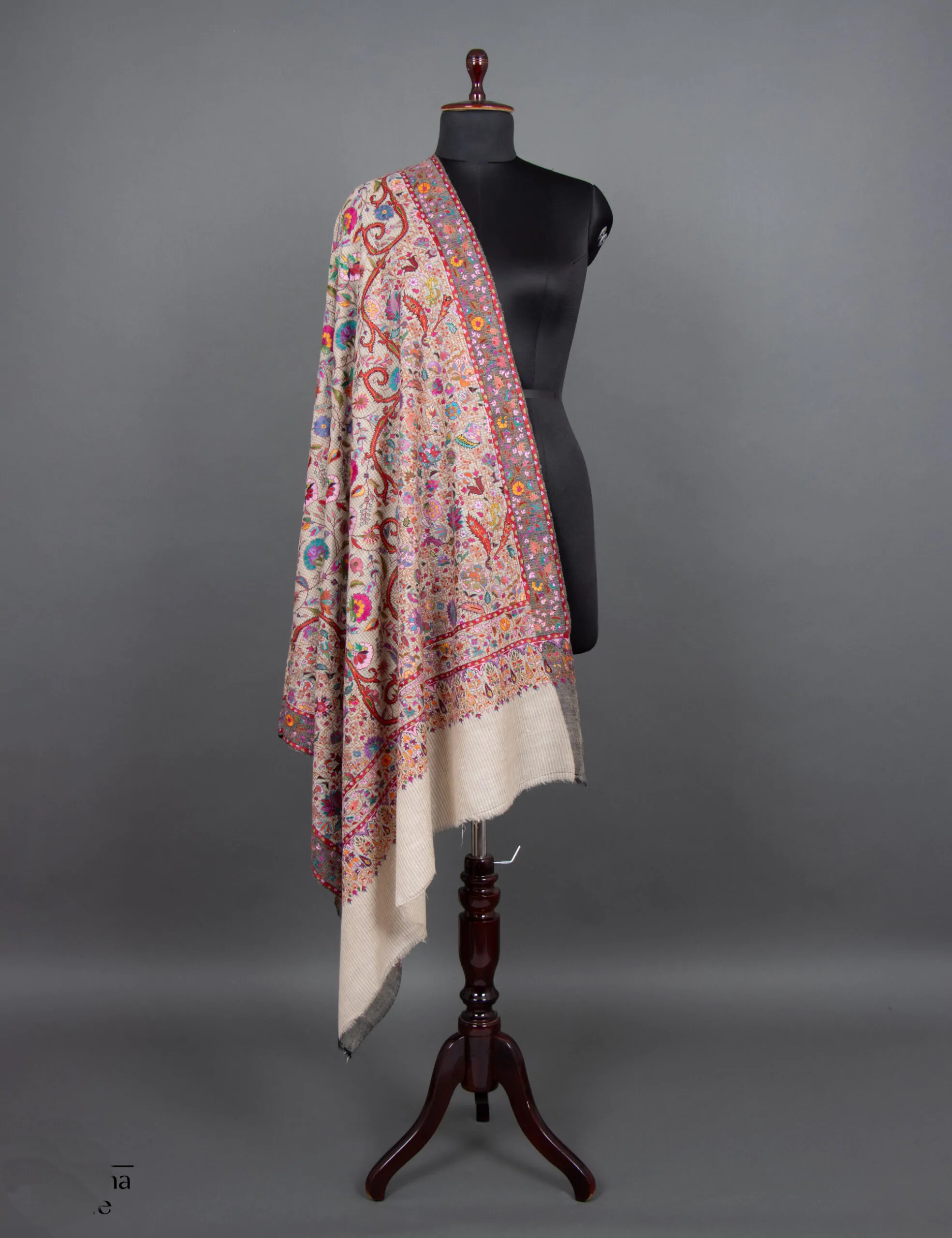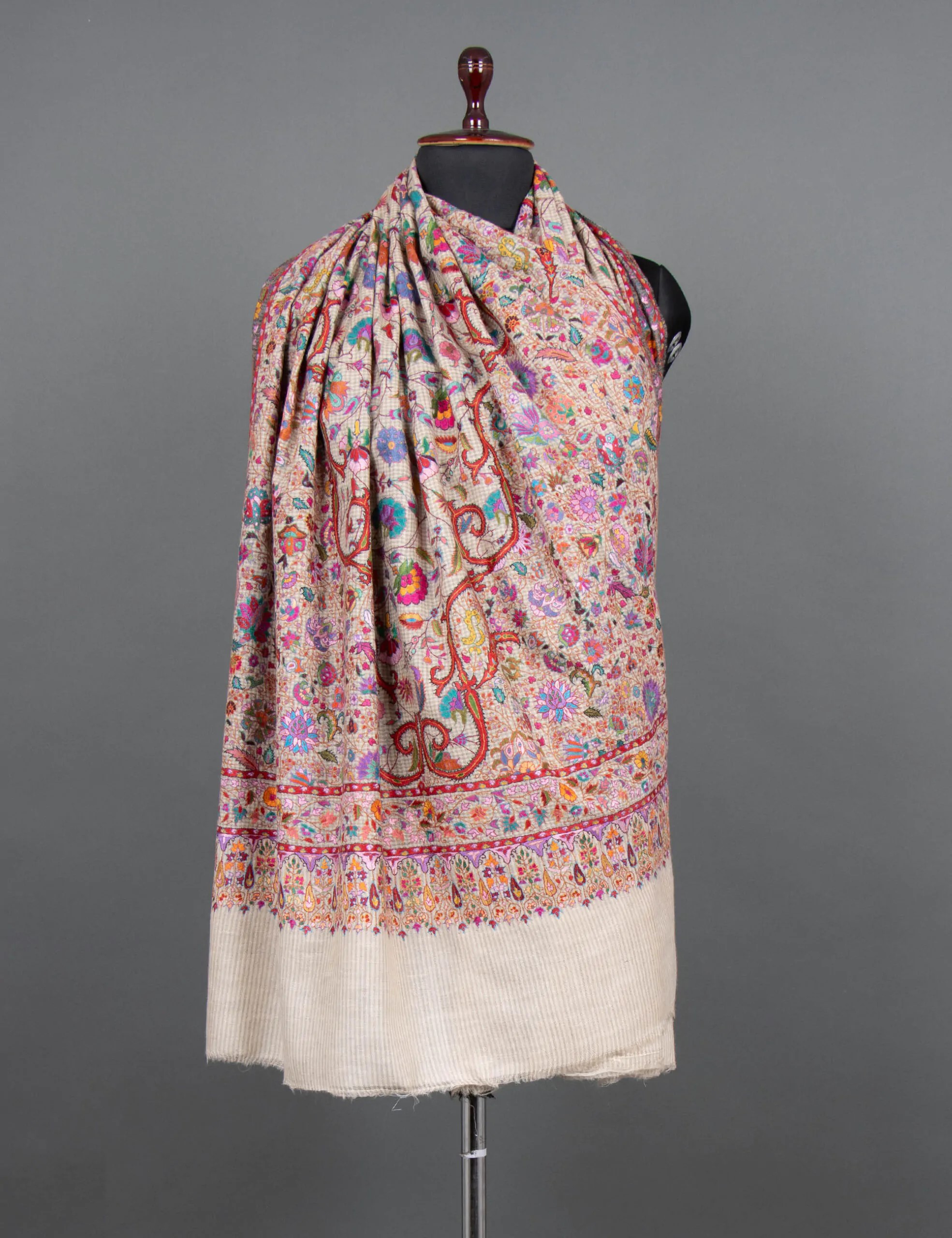 This Pashmina shawl is a luxurious and meticulously hand-embroidered accessory made from the finest, softest Pashmina. It combines elegance and comfort, featuring delicate floral patterns on a backdrop of subtle mini-checks. The design creates a captivating visual appeal, offering a timeless and sophisticated addition to any outfit. The shawl is a statement piece that allows you to wrap yourself in luxury and elevate your style with its exquisite craftsmanship.