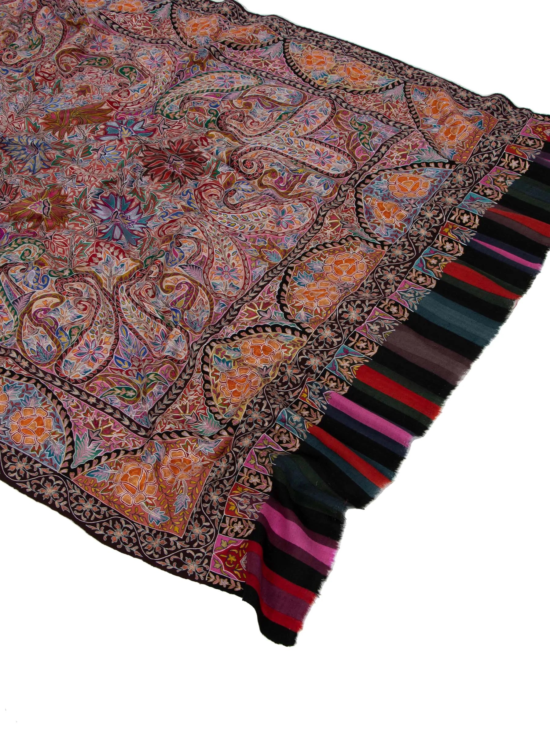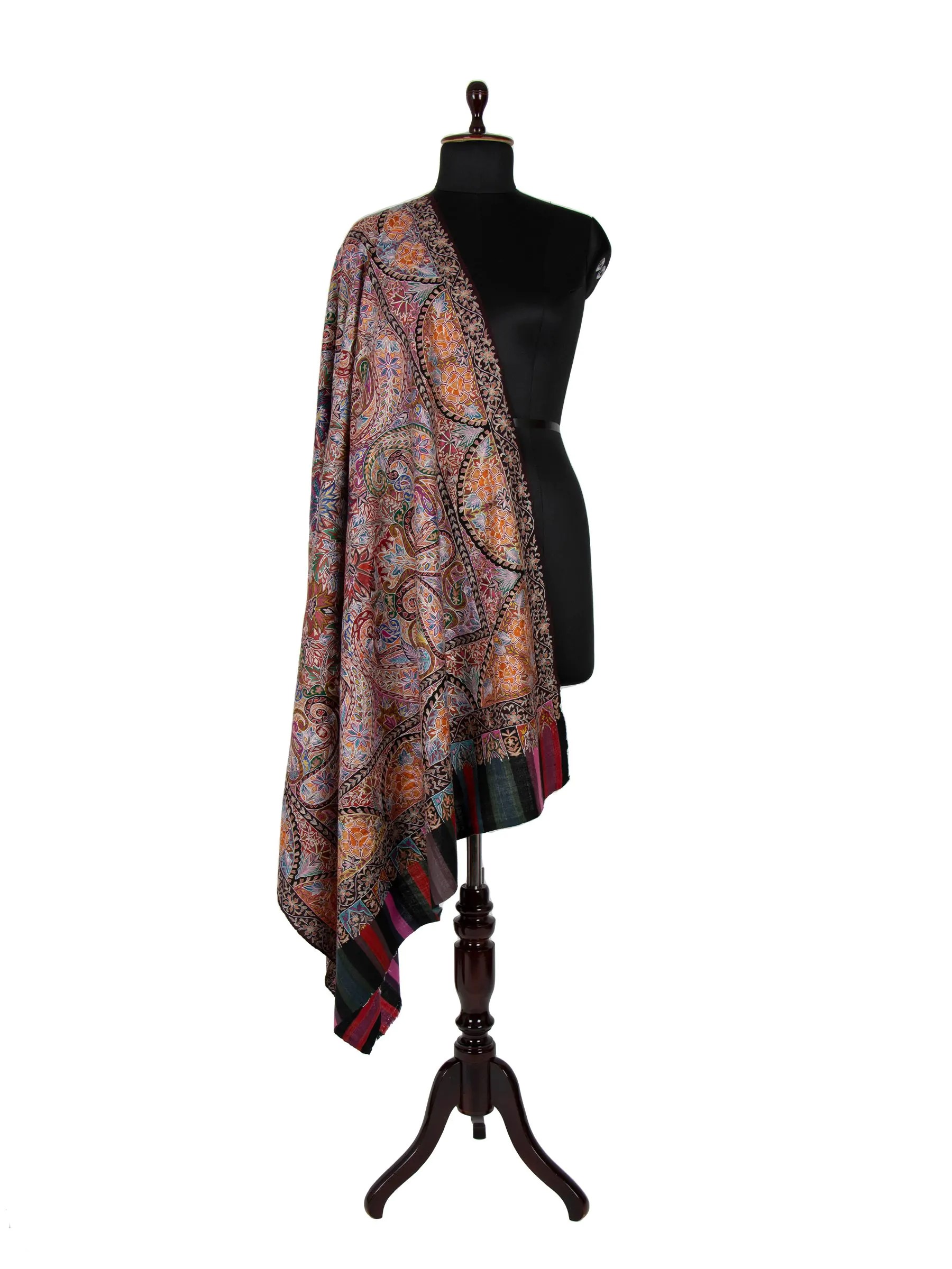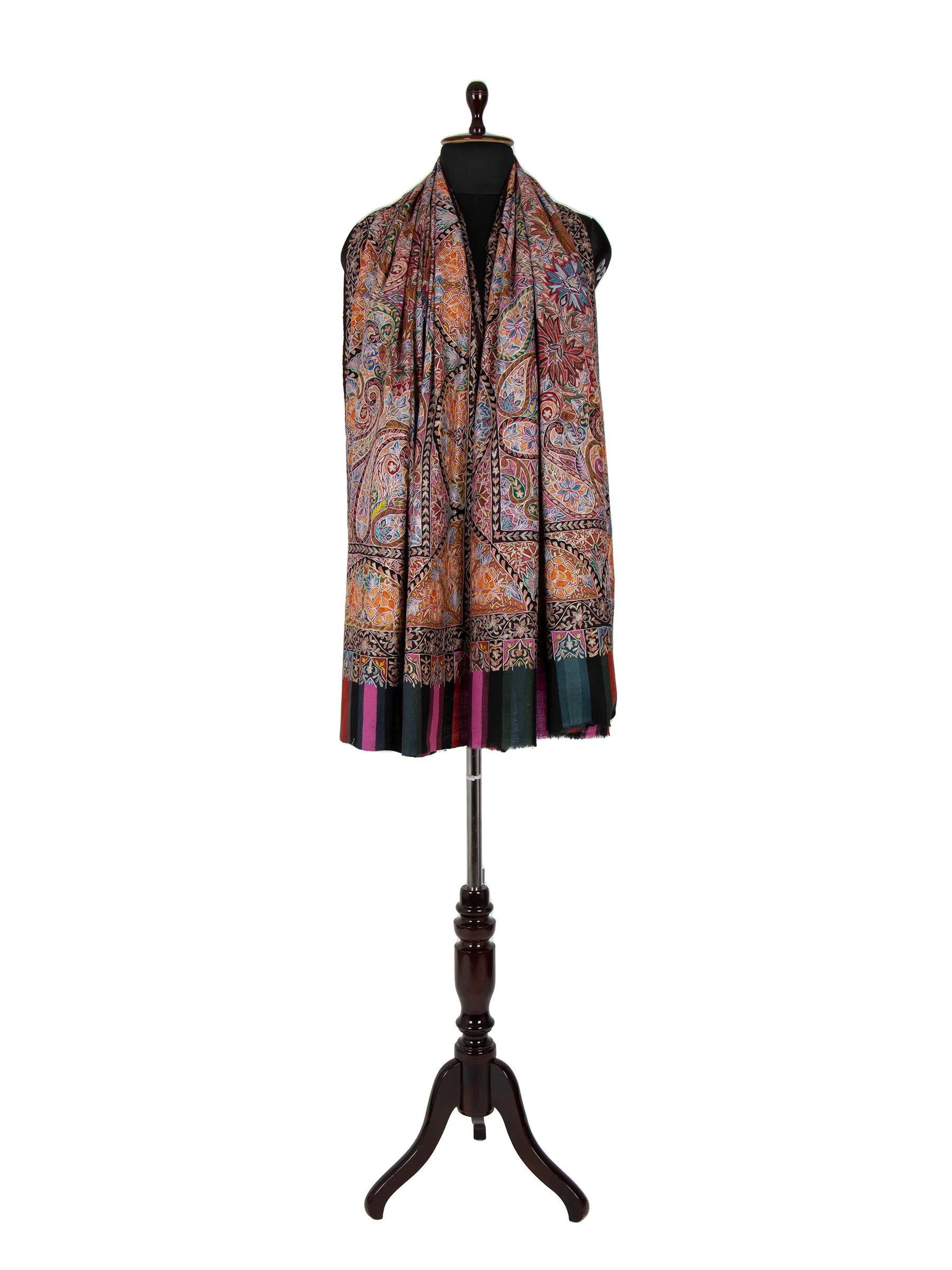 The Kalamkari Pashmina Shawl is a luxurious accessory crafted from pure Pashmina wool in the Kashmir Valley, showcasing intricate paisley and floral designs using traditional Kalamkari techniques. Its features include being lightweight, soft, and made by skilled artisans. Benefits include enhancing the elegance of any black dress, durability, authenticity, and comfortable wear.