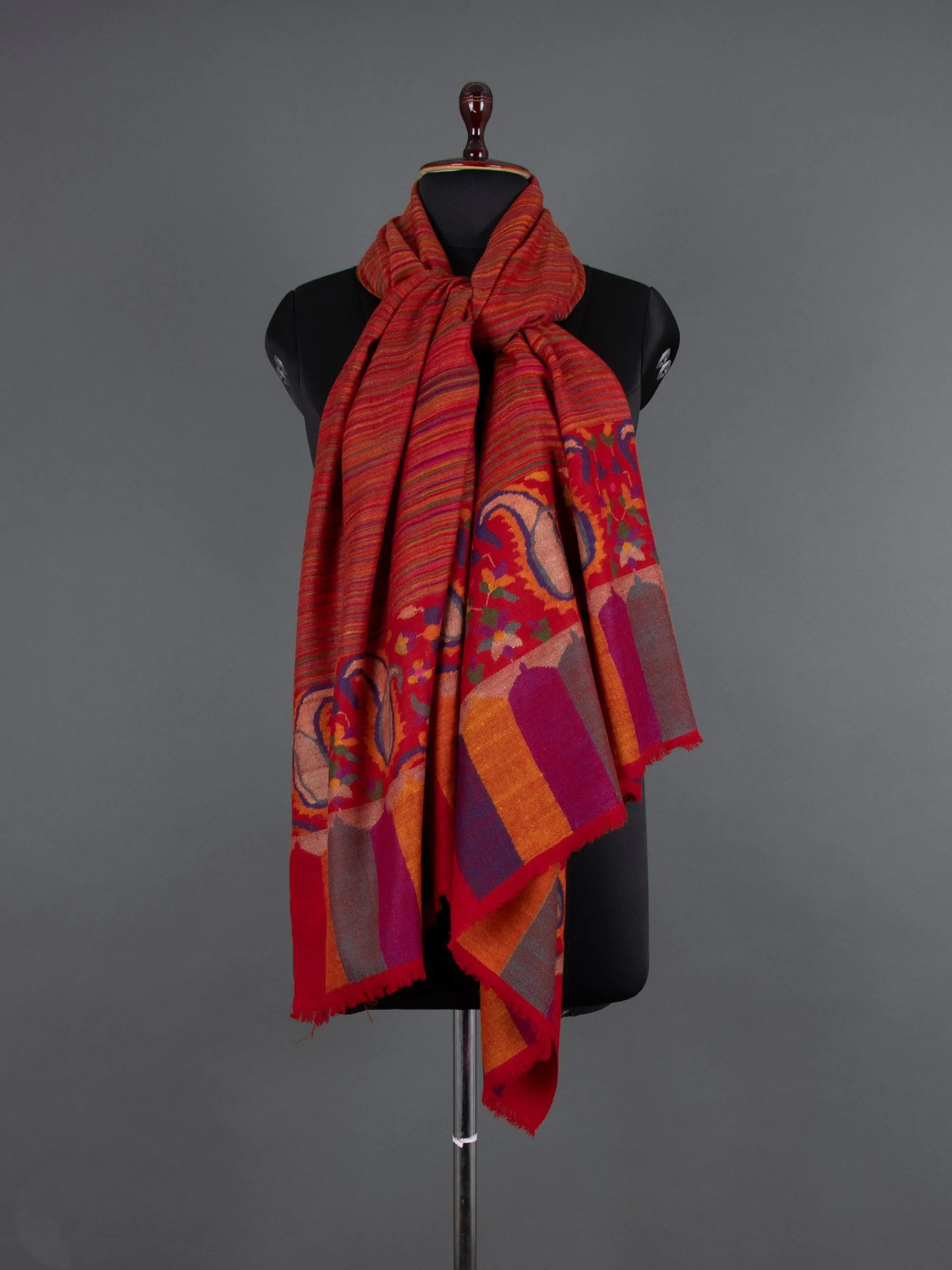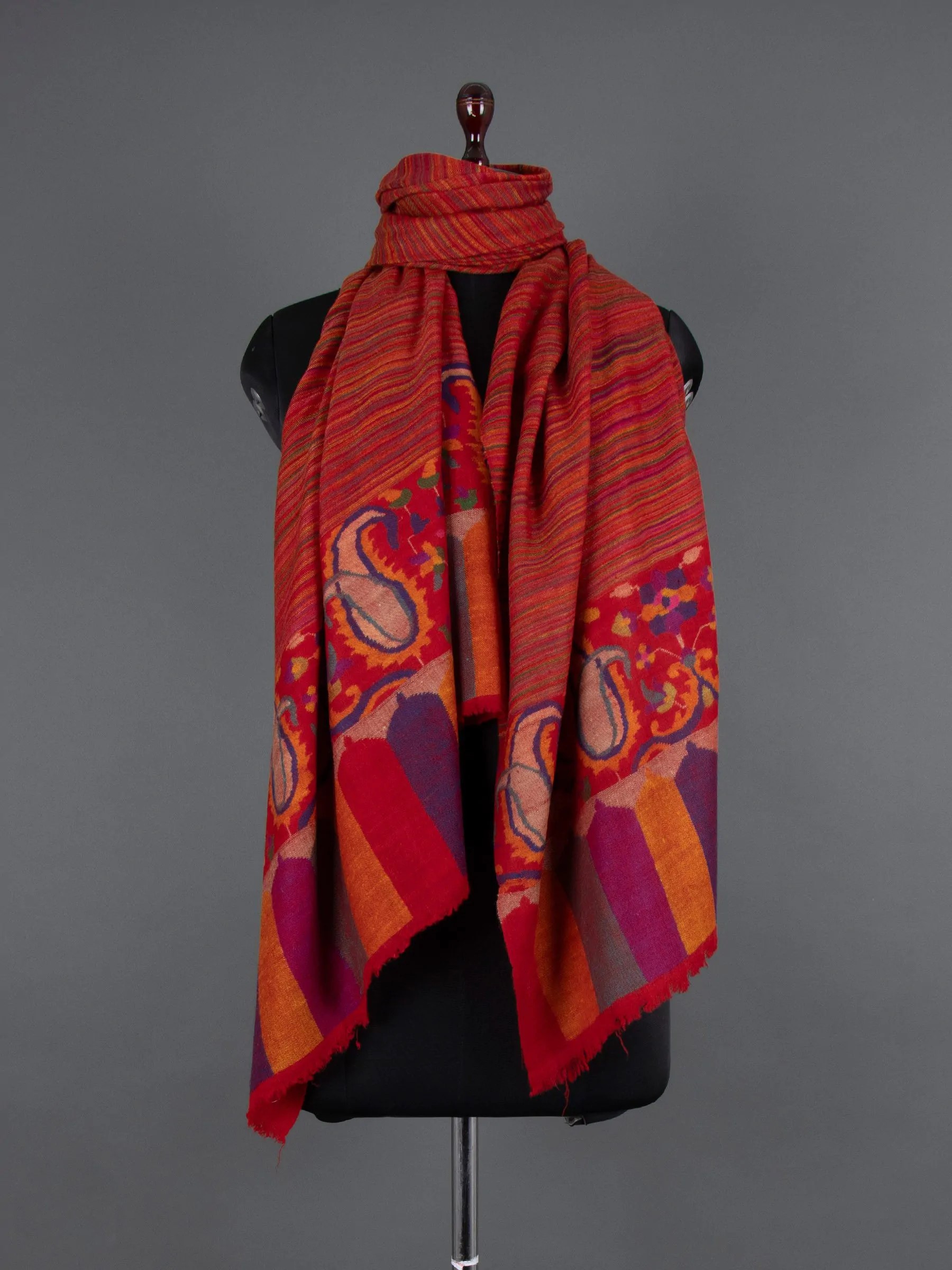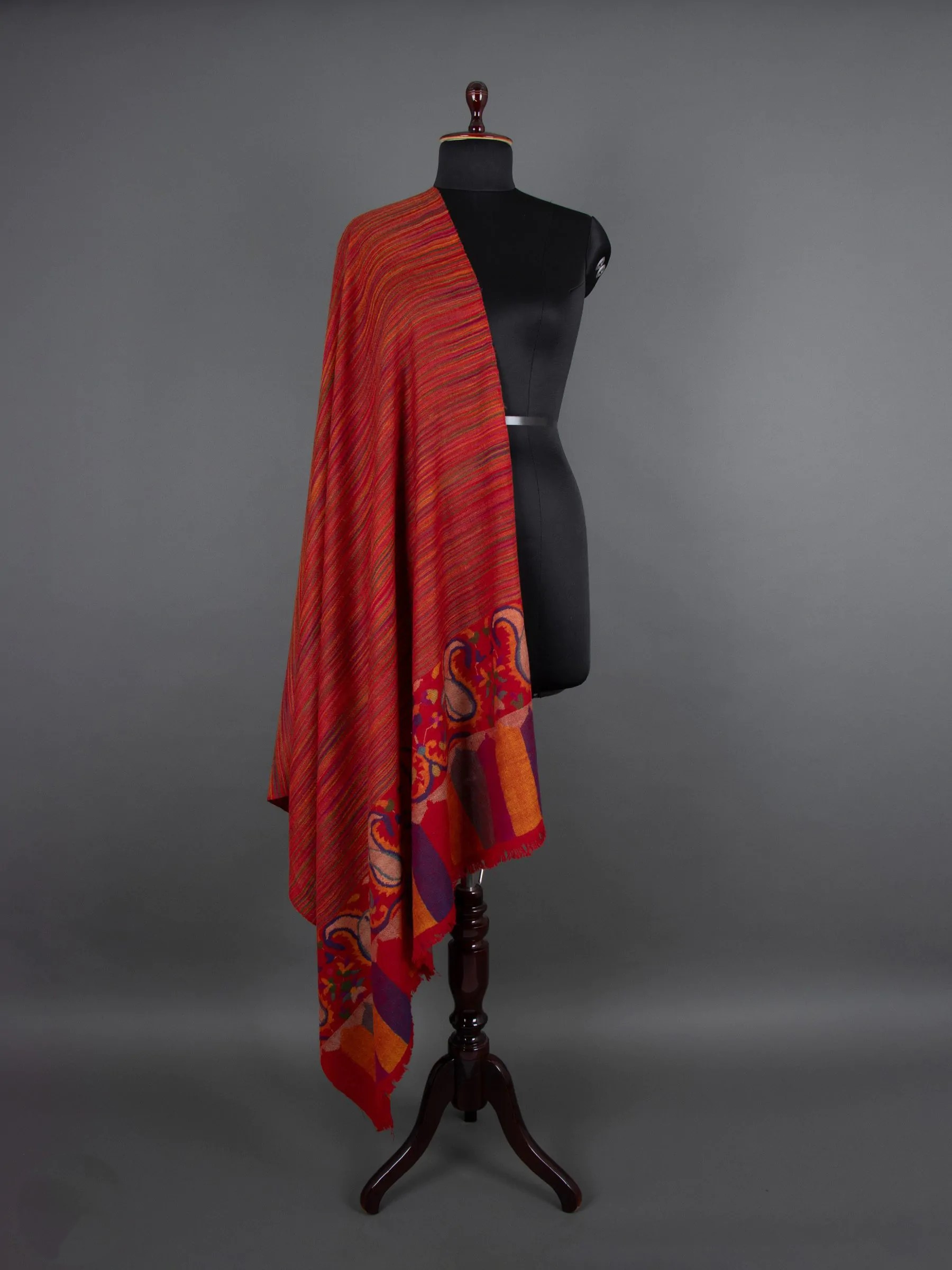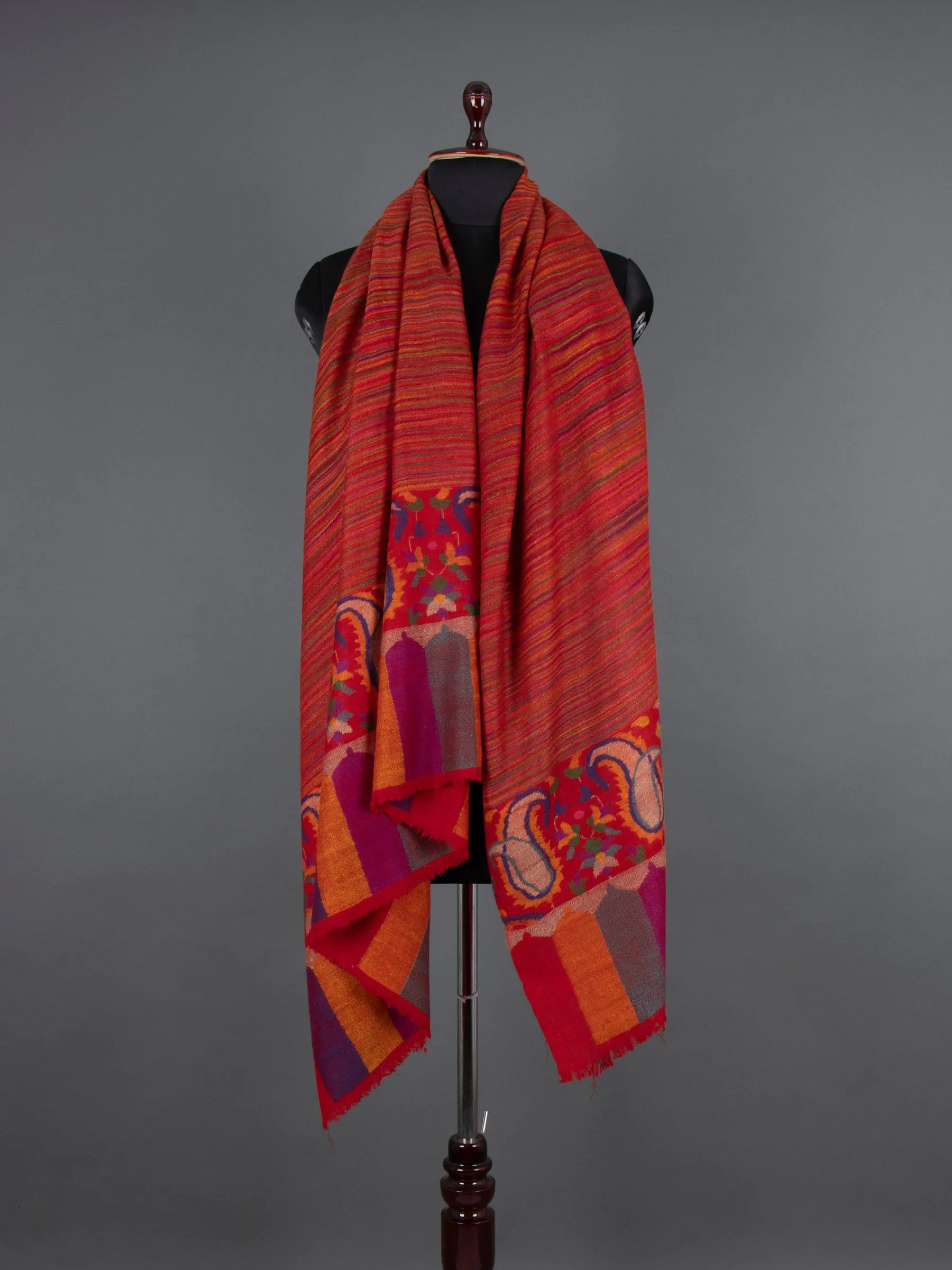 The Noor-E-Masrang Kani Pashmina Shawl is a finely crafted masterpiece showcasing artisanal skill and attention to detail. Its borders feature exquisite Kani motifs that enhance the diverse shades of Cashmere. Opulent patterns seamlessly blend, radiating grandeur and luxury. The serene colors draw inspiration from nature and heritage, creating a tranquil floral tapestry that envelops the wearer in elegance and tradition.