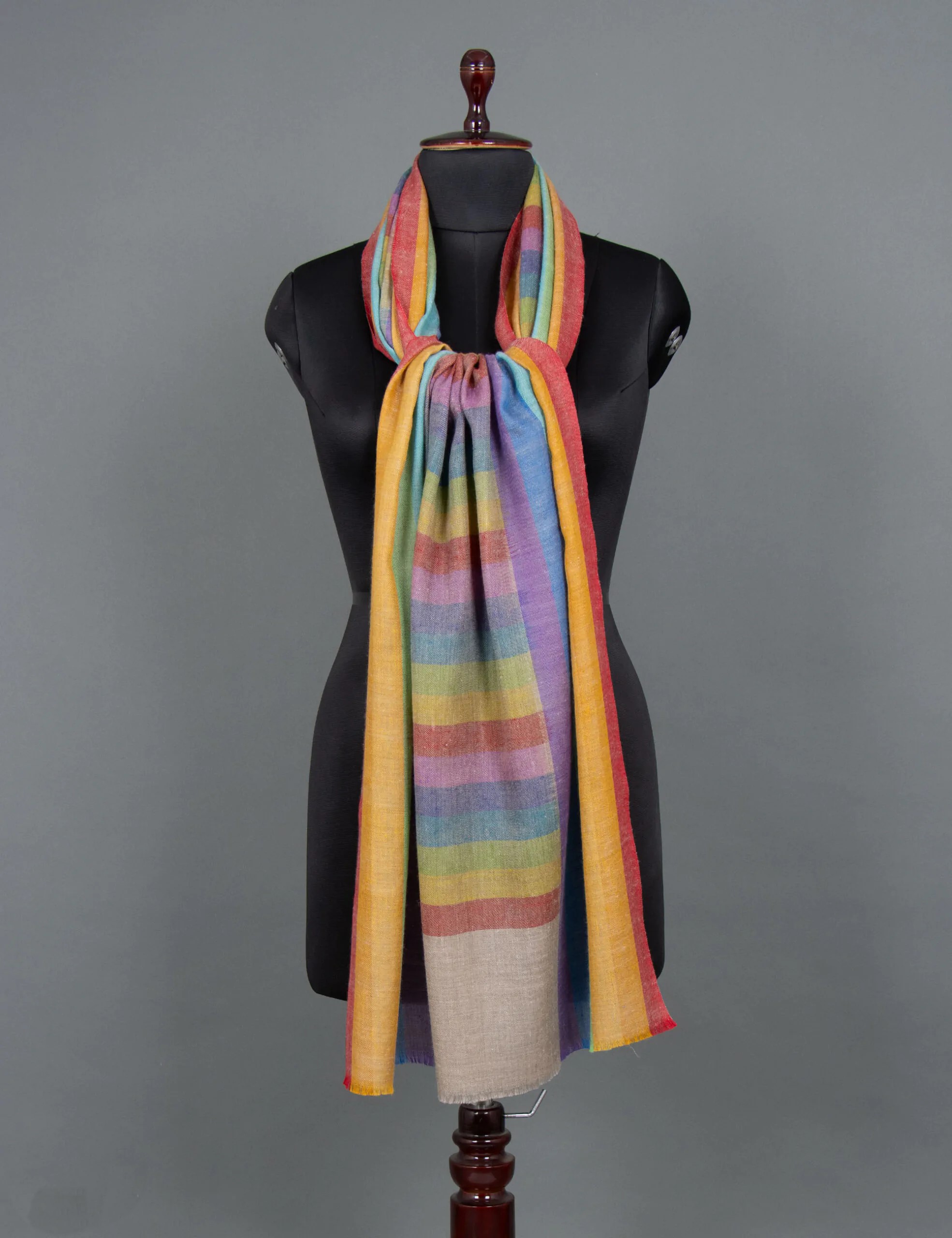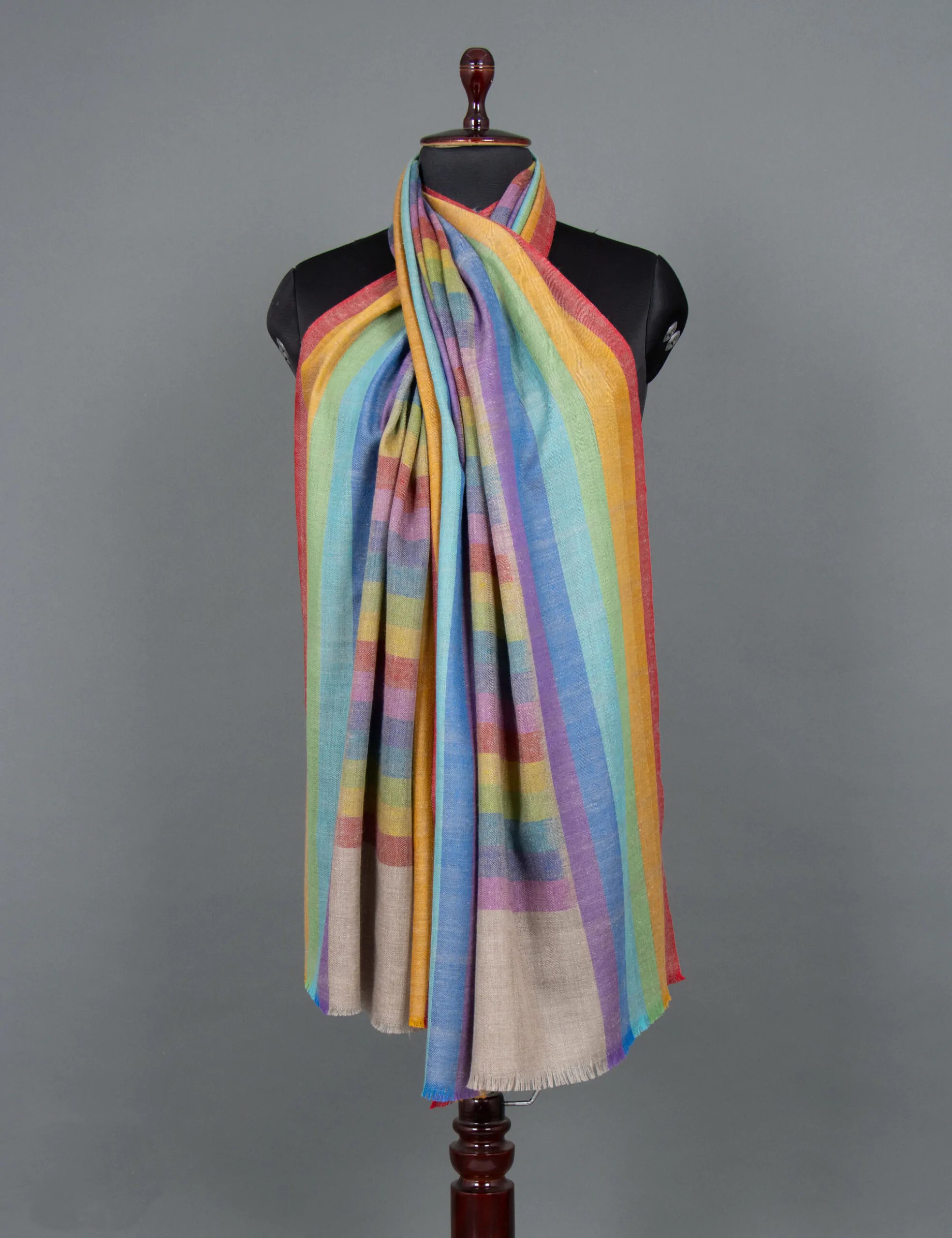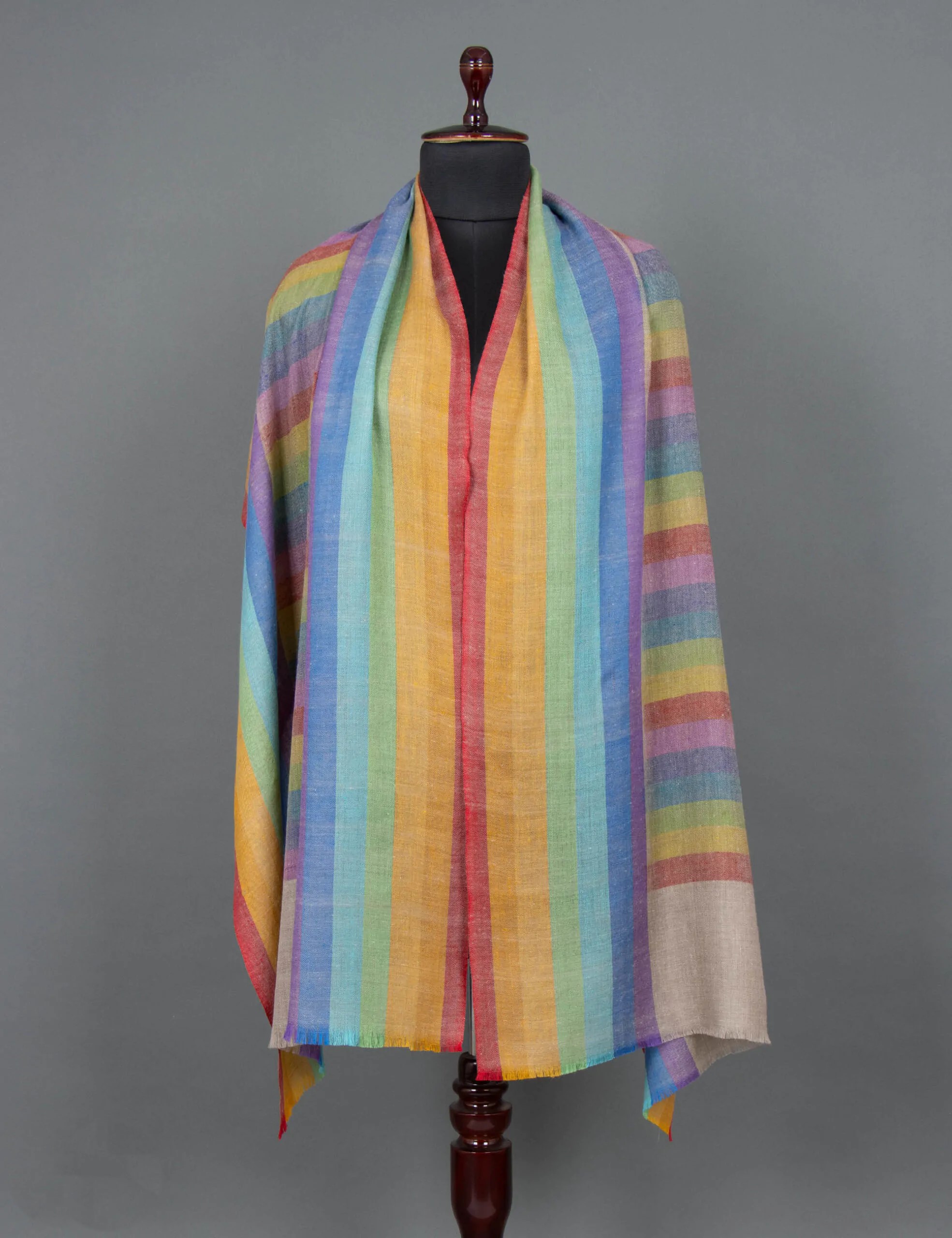 Indulge in luxury with our Rainbow Weave Ikat Pashmina wrap, a masterpiece handcrafted in Kashmir. This exquisite shawl reflects the unmatched skill of artisans, created from 100% Capra Hircus Goat cashmere—the finest in the world—for unparalleled softness and warmth.