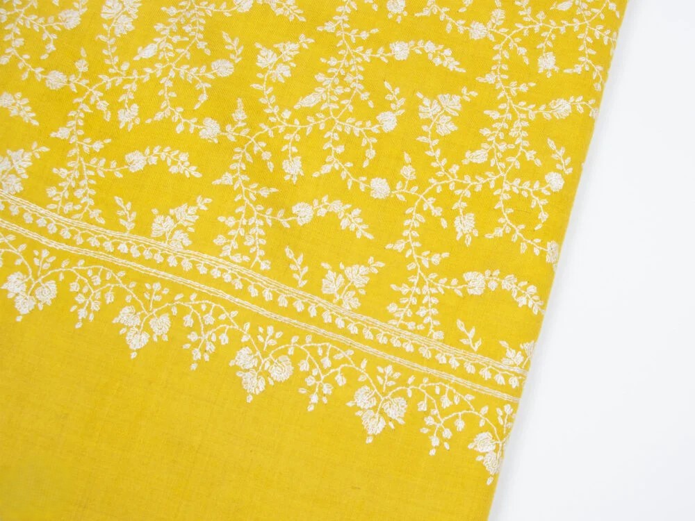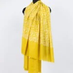The Saffron Heritage Pashmina Shawl showcases exquisite embroidery motifs cascading across its base, celebrating the blend of handwoven craftsmanship and intricate hand-embroidery. This stunning shawl is a visual masterpiece that honors timeless heritage arts.