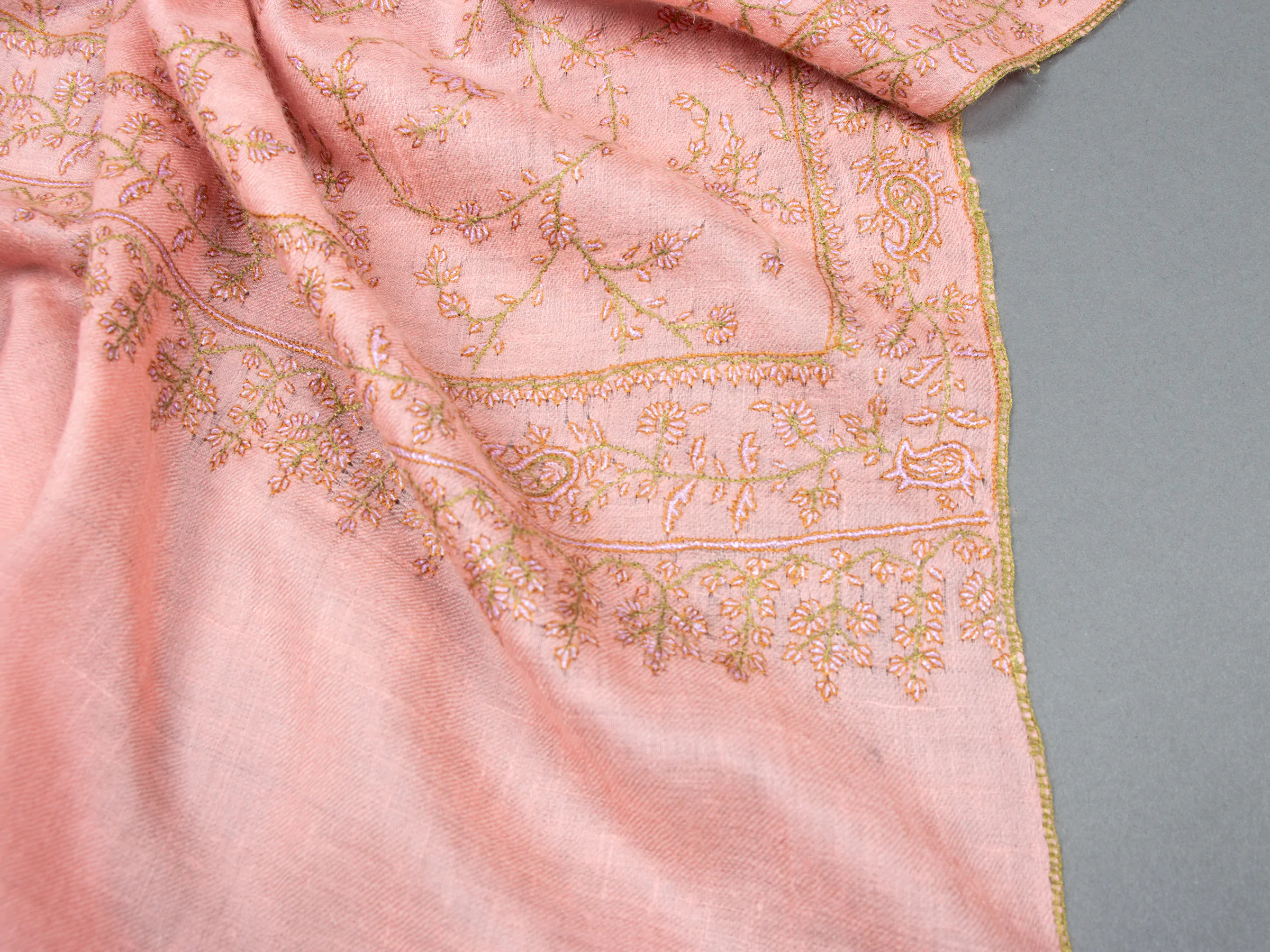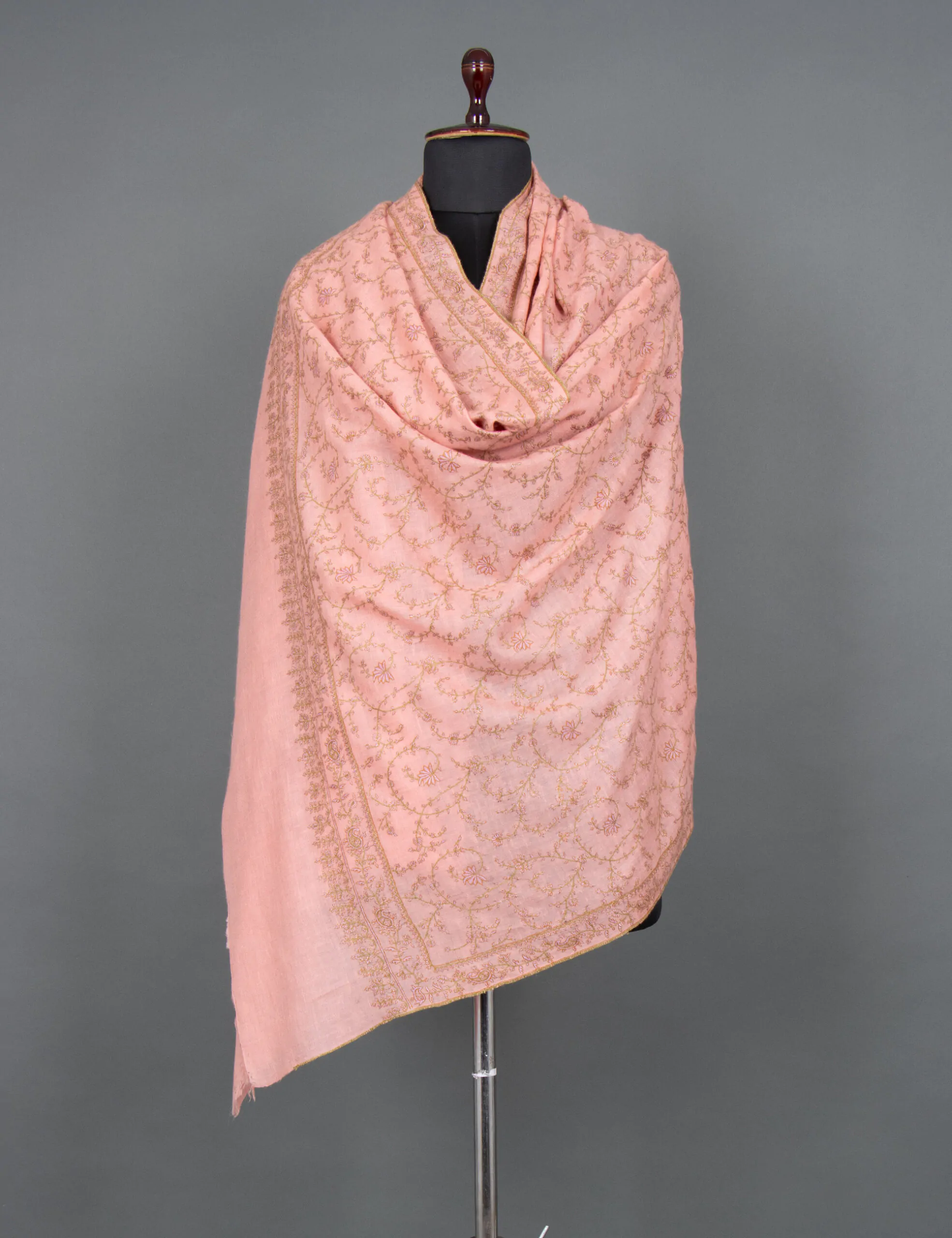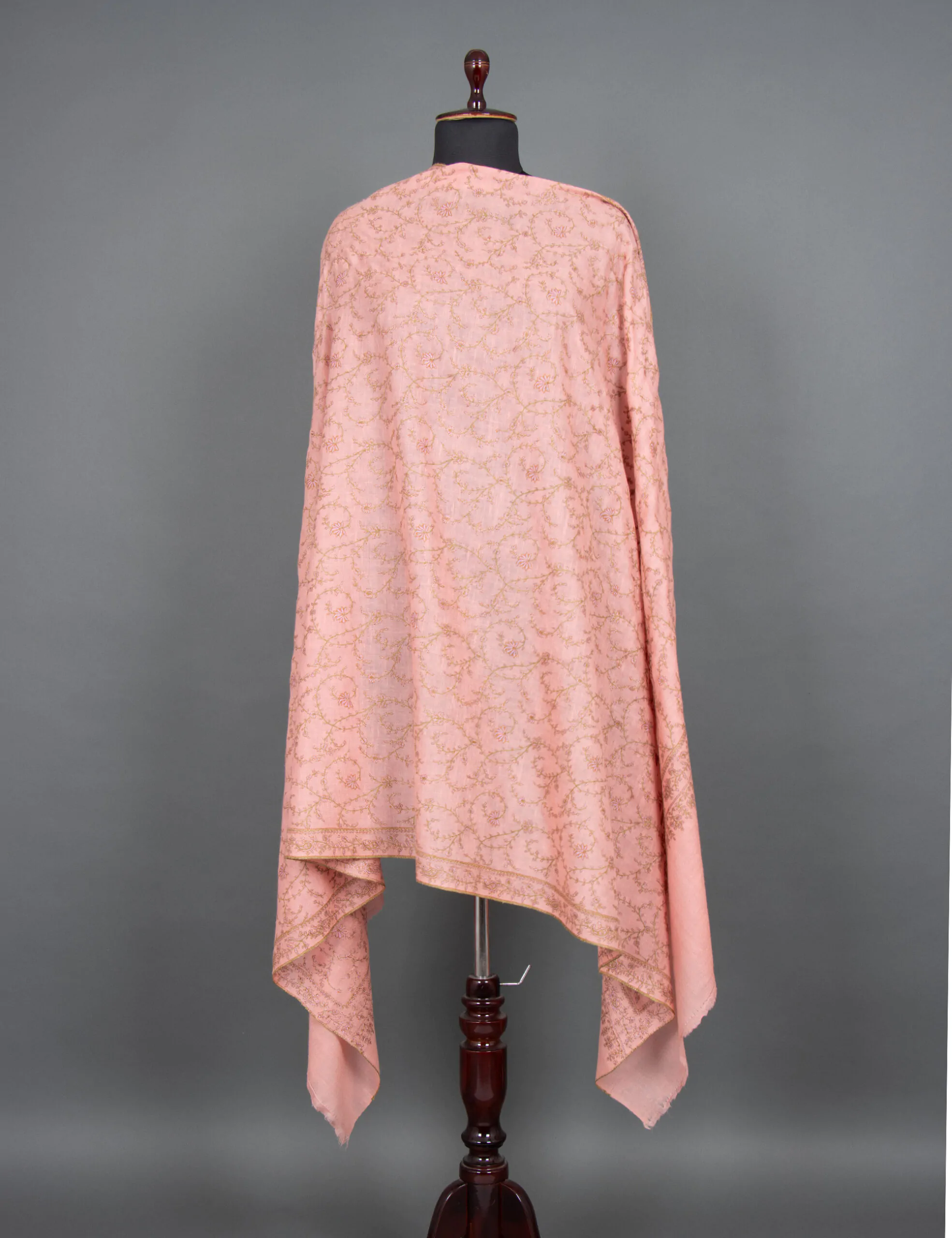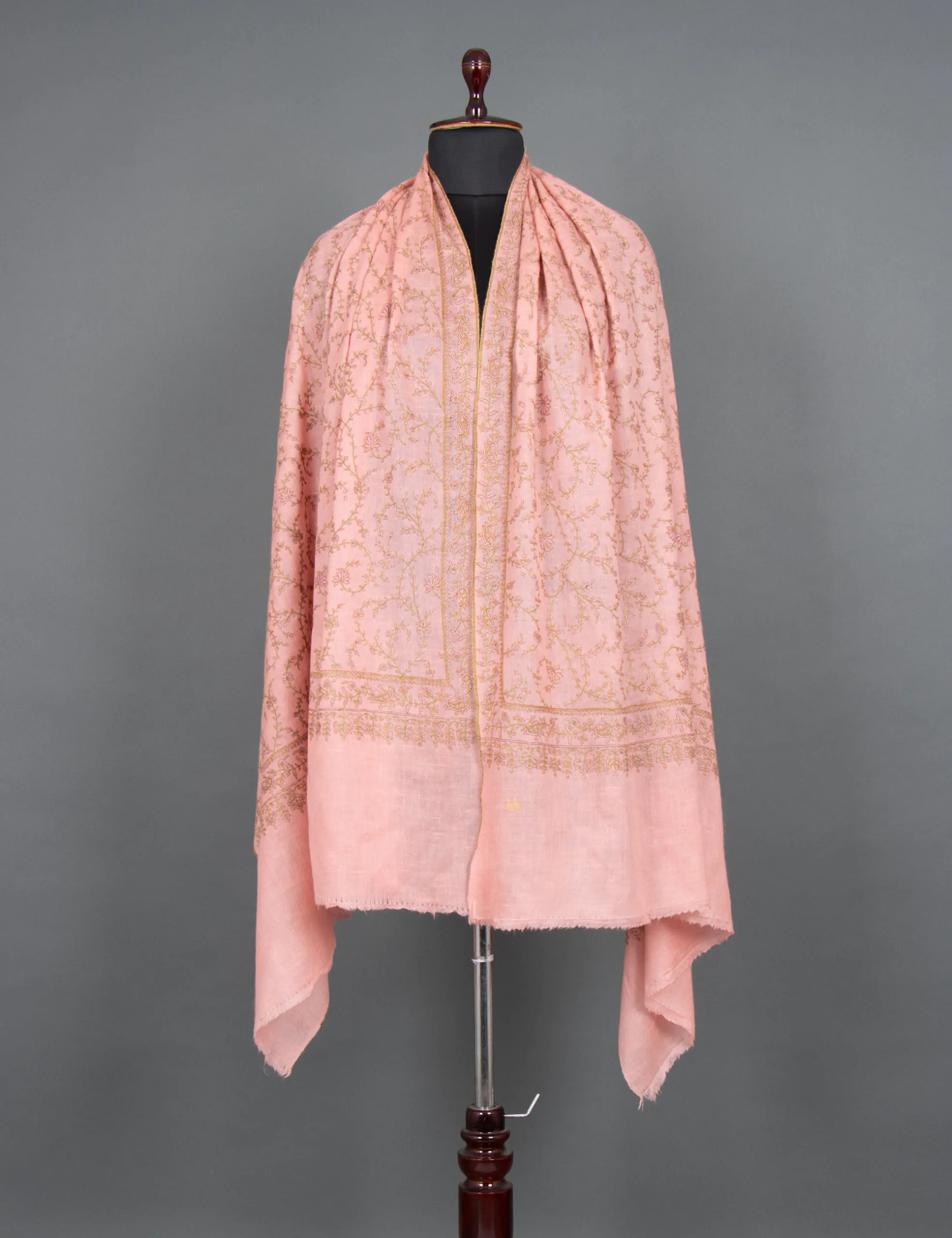 “Soft Pink Embroidered Bliss: Graceful Pashmina Wrap” is an exquisite shawl that pays homage to heritage art. Handwoven and meticulously hand-embroidered, this piece showcases intricate motifs cascading over its base, capturing the essence of timeless beauty. Reminiscent of ancient craftsmanship, it revives the tradition of crafting pashmina shawls for royalty, using the finest Cashmere wool sourced from Ladakh. Each delicate embroidery motif adds a regal allure, making it a testament to the artistry and elegance of bygone eras.”
