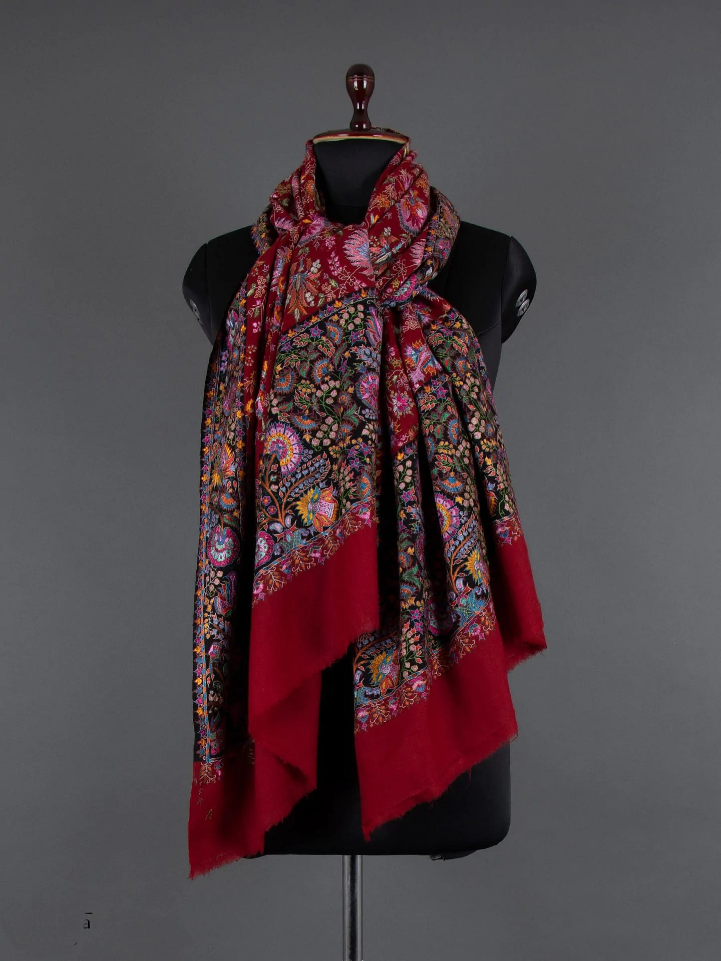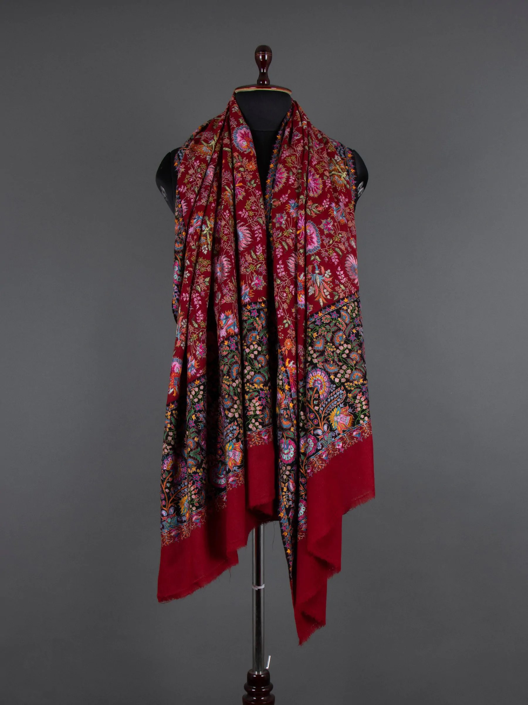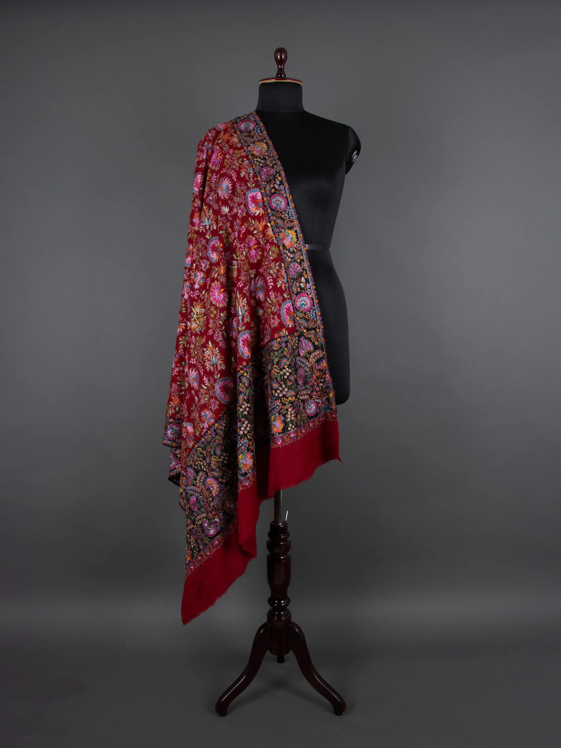 The Velvet Wine Elegance Pashmina Jamawar is a luxurious shawl adorned with intricate designs, showcasing rich handicraft. With a cascade of paisleys and florets, the shawl features Indian hand embroidery in warm maroon tones. Reflecting the beauty of nature through unique paisley motifs, this all-over embroidered masterpiece exudes luxury and elegance, making it a perfect accessory for draping oneself in style.