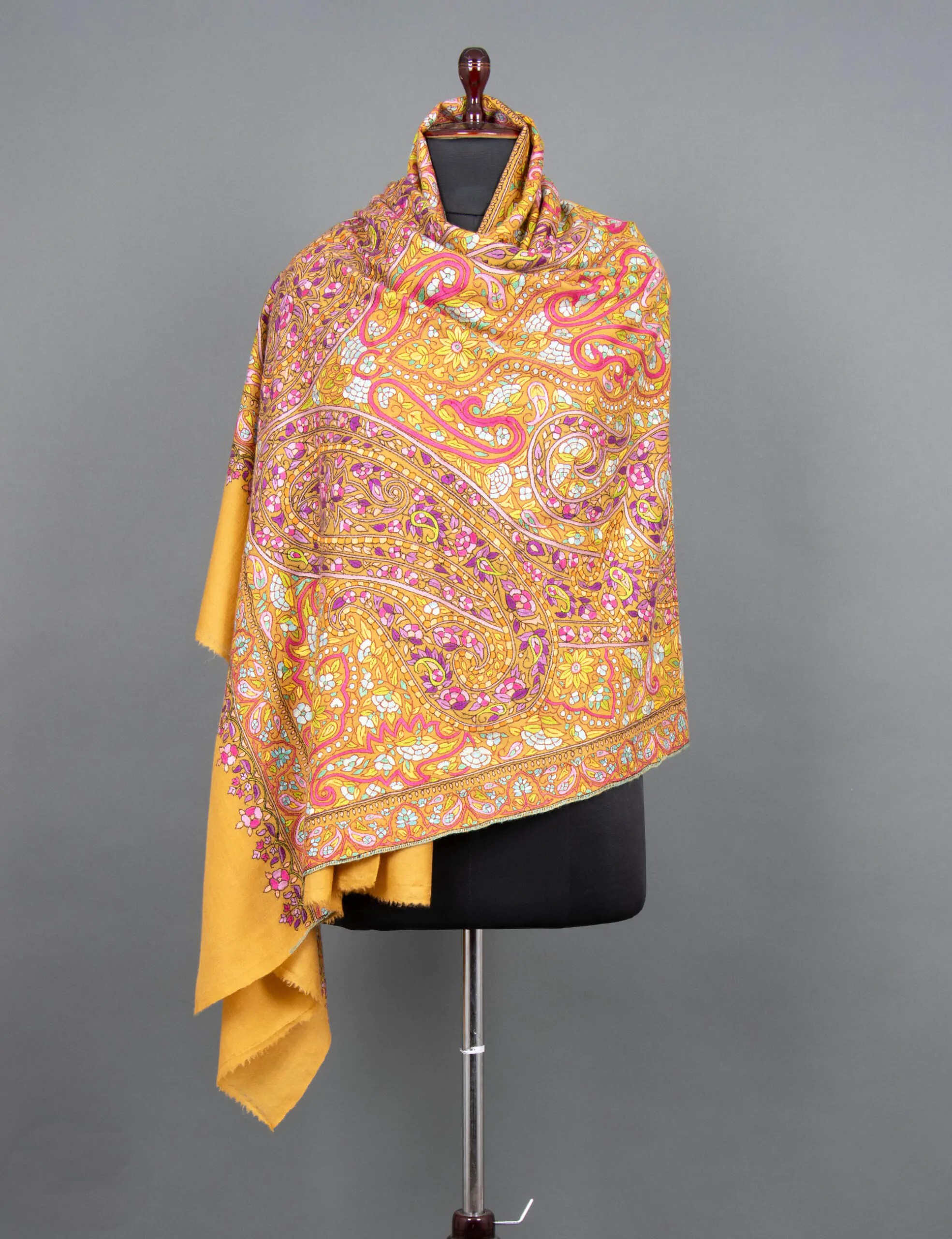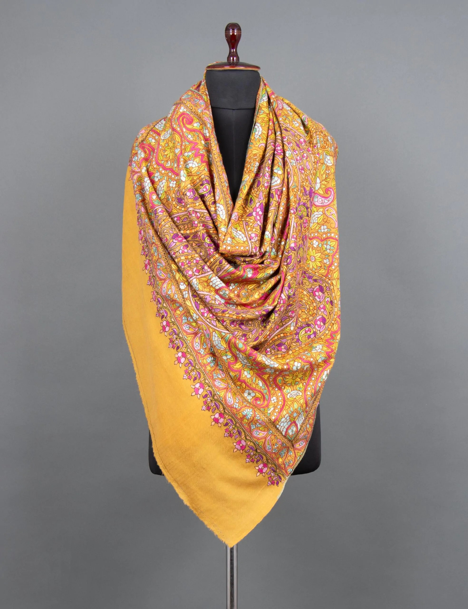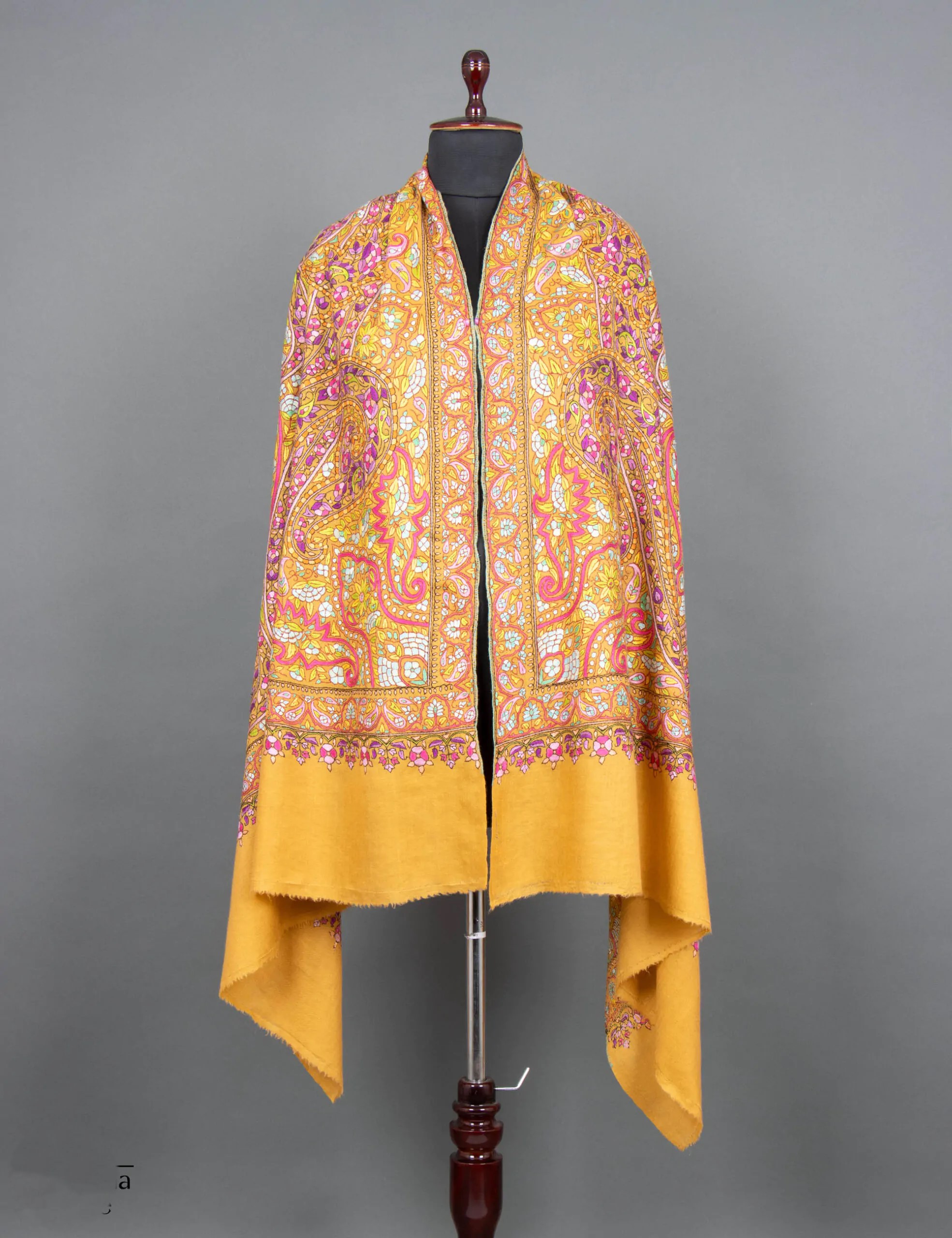 This exquisite pashmina jamawar is a true masterpiece, showcasing unparalleled craftsmanship. Its delicate stitches weave a narrative of artistry and elegance, making it a unique and irreplaceable addition to any wardrobe. Meticulously hand-embroidered with intricate details, this luxurious wrap offers both warmth and style. The vibrant hues of the sunrise-inspired design bring a sense of joy and optimism, infusing radiance into any outfit. Elevate your fashion with this timeless accessory that effortlessly blends comfort and sophistication, ensuring you own a piece of beauty that captivates and astonishes all who behold it.