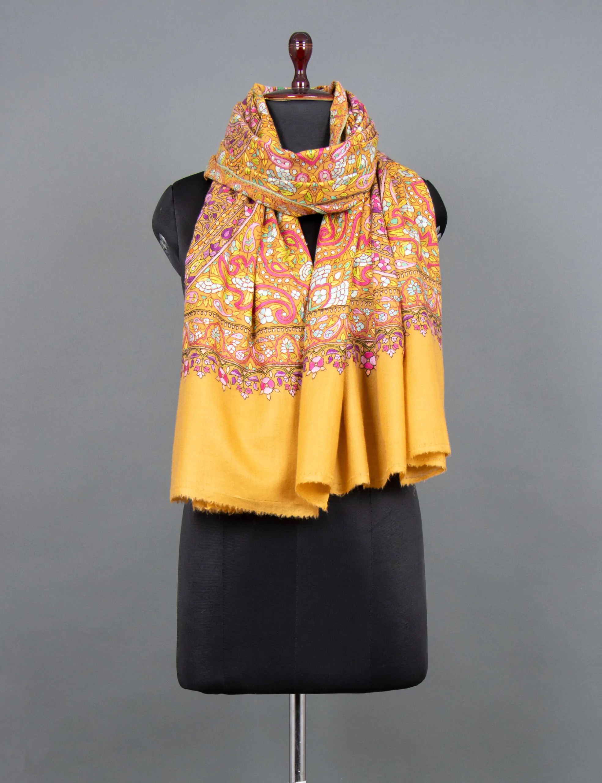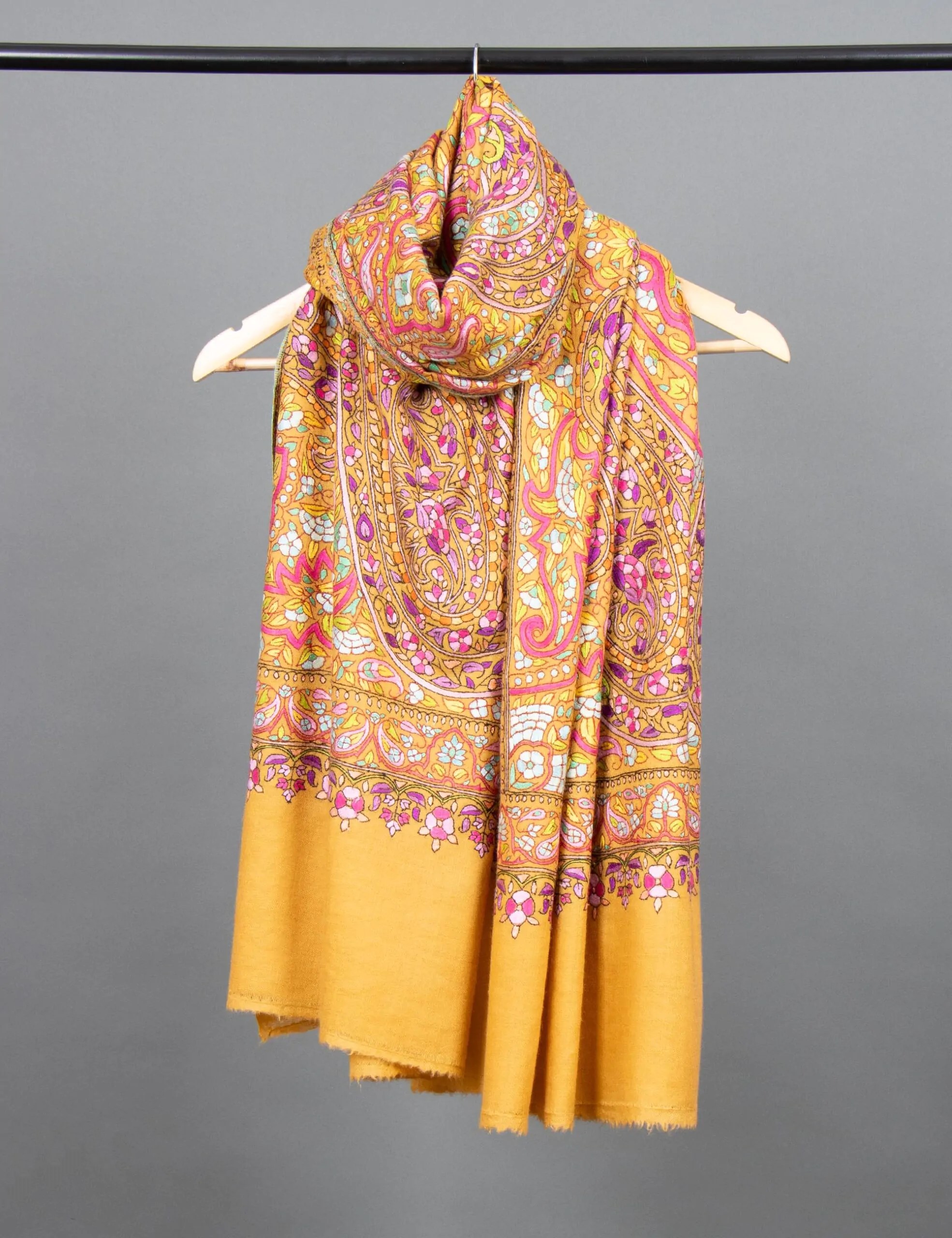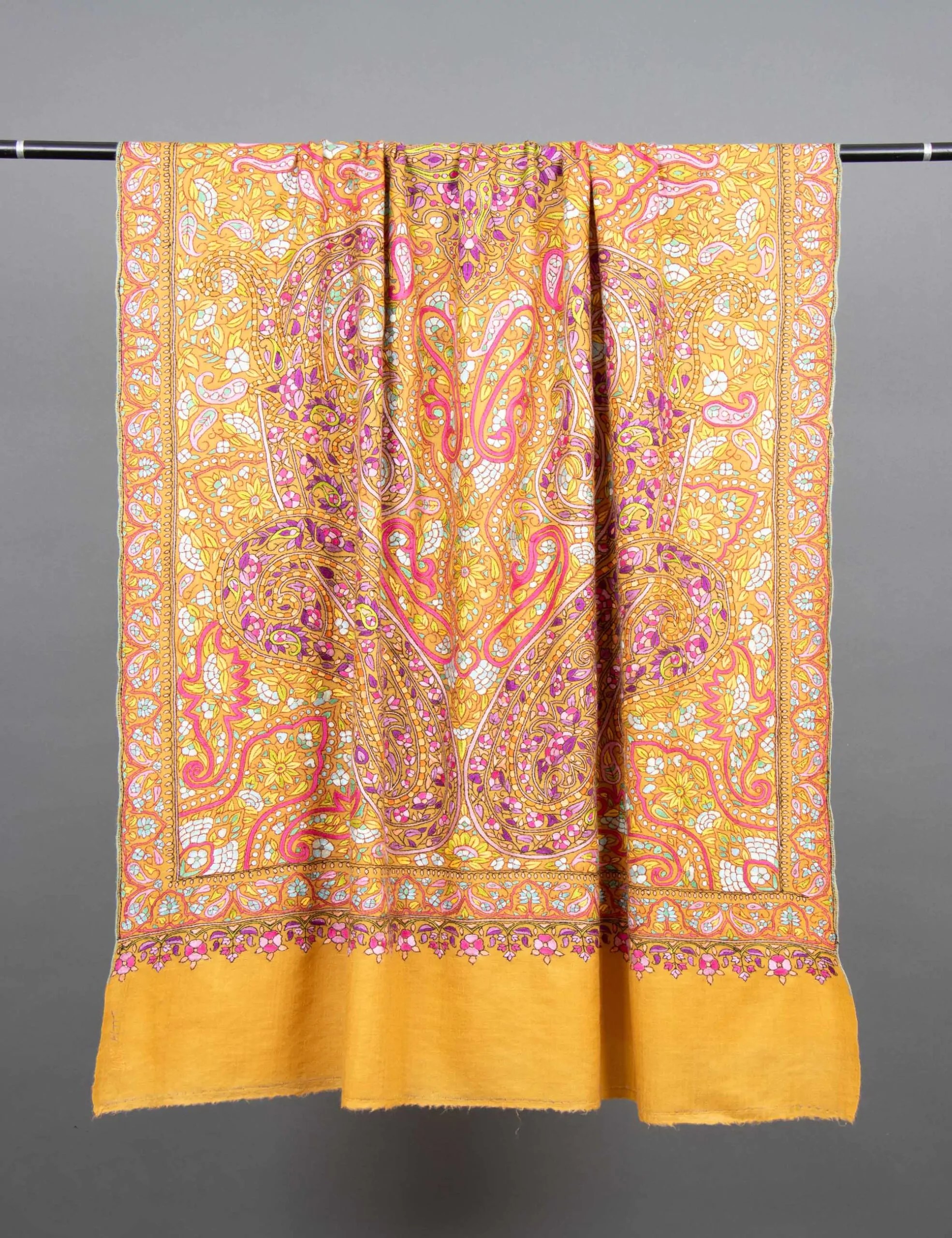 This exquisite pashmina jamawar is a true masterpiece, showcasing unparalleled craftsmanship. Its delicate stitches weave a narrative of artistry and elegance, making it a unique and irreplaceable addition to any wardrobe. Meticulously hand-embroidered with intricate details, this luxurious wrap offers both warmth and style. The vibrant hues of the sunrise-inspired design bring a sense of joy and optimism, infusing radiance into any outfit. Elevate your fashion with this timeless accessory that effortlessly blends comfort and sophistication, ensuring you own a piece of beauty that captivates and astonishes all who behold it.